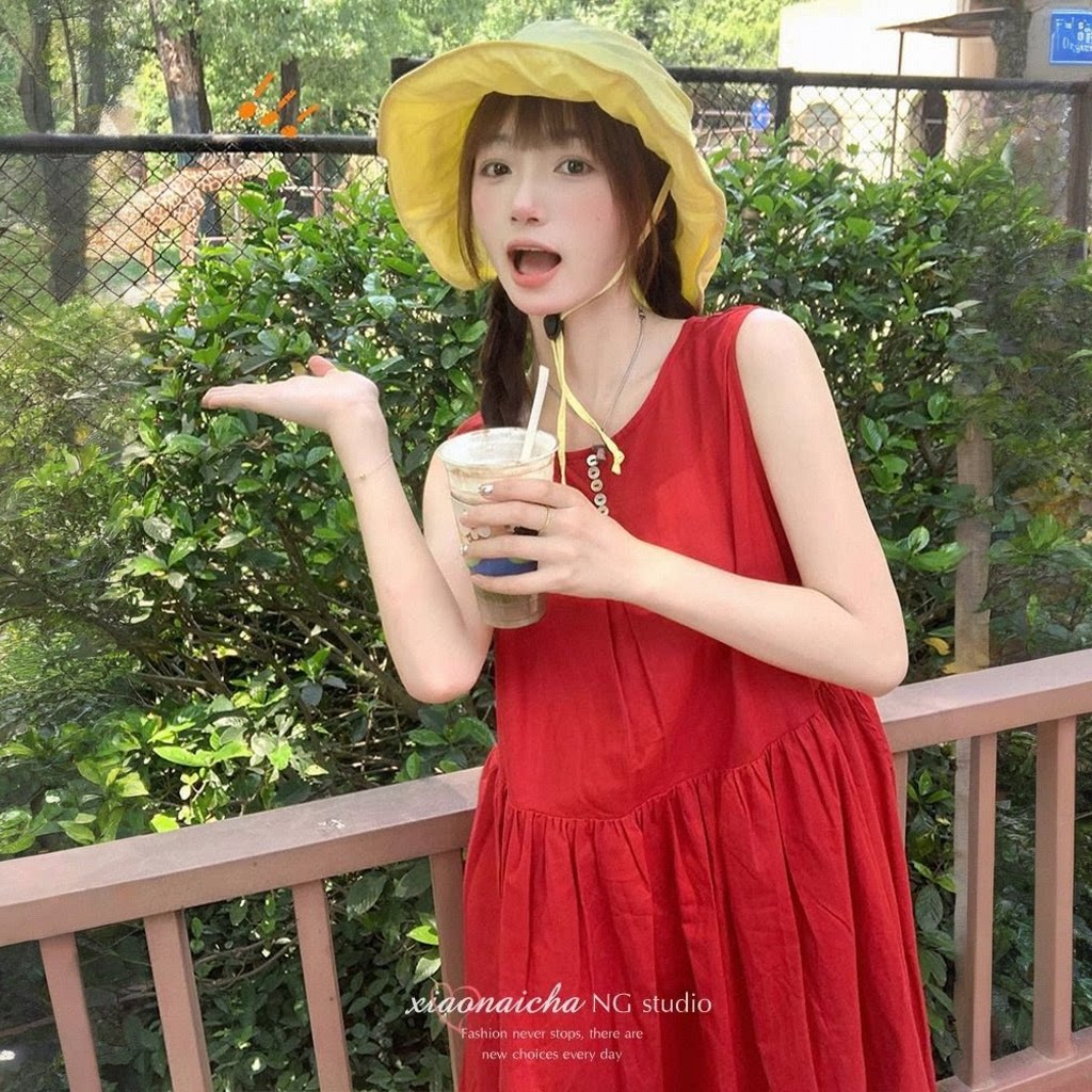 法式复古红色无袖系带背心连衣裙女夏季新款小个子收腰显瘦中长裙