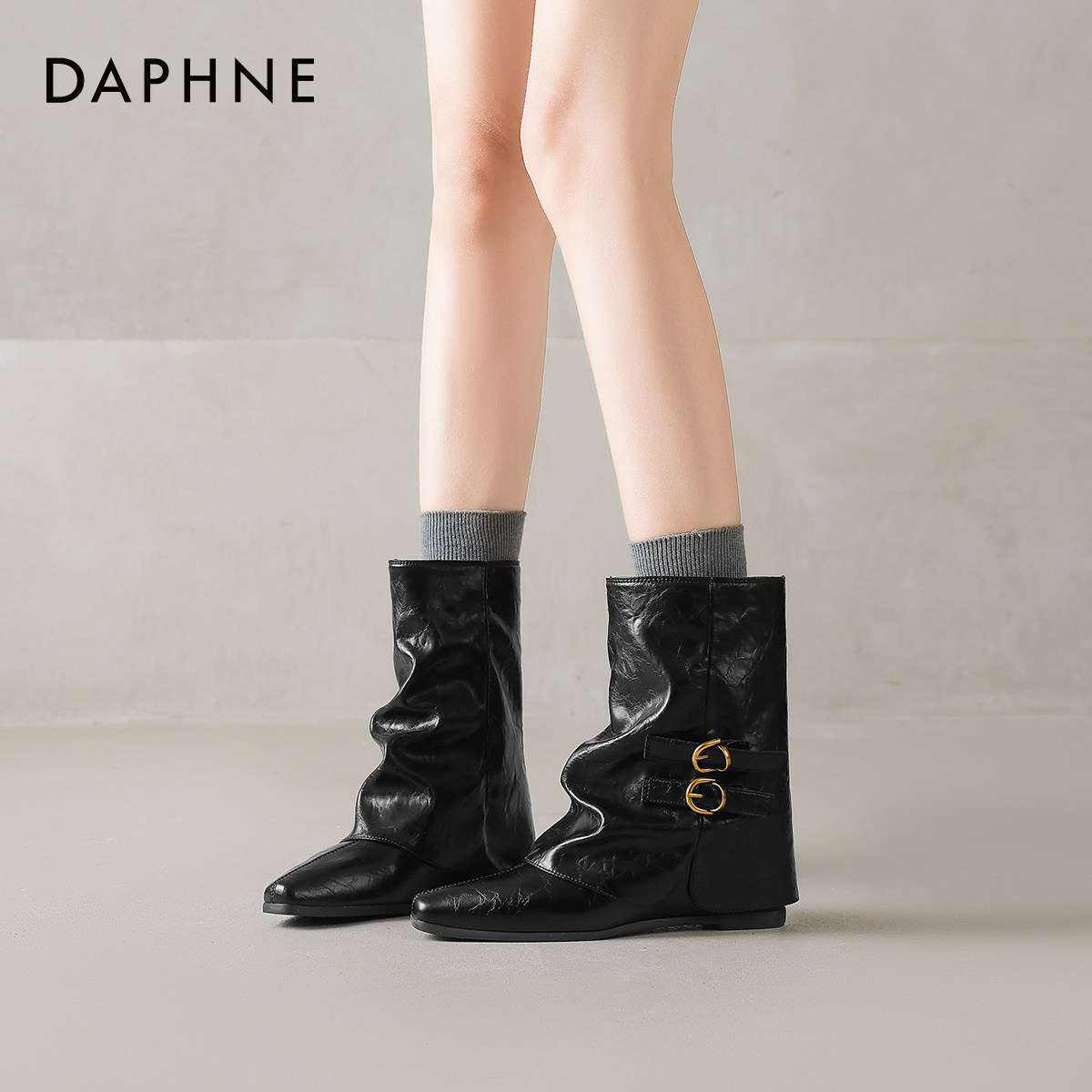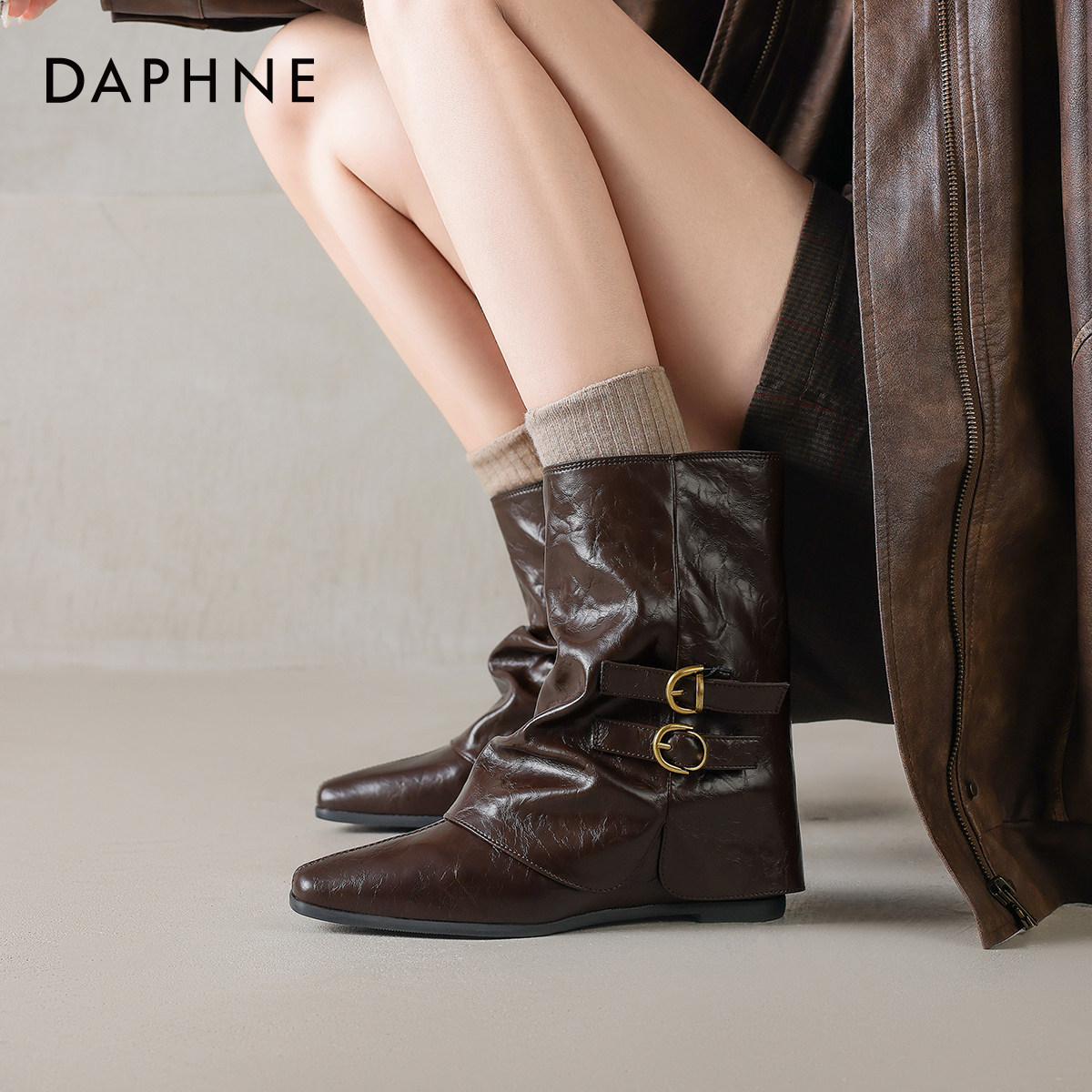 达芙妮棕色短靴女2026新款冬季西部牛仔骑士加绒尖头内增高裤管靴