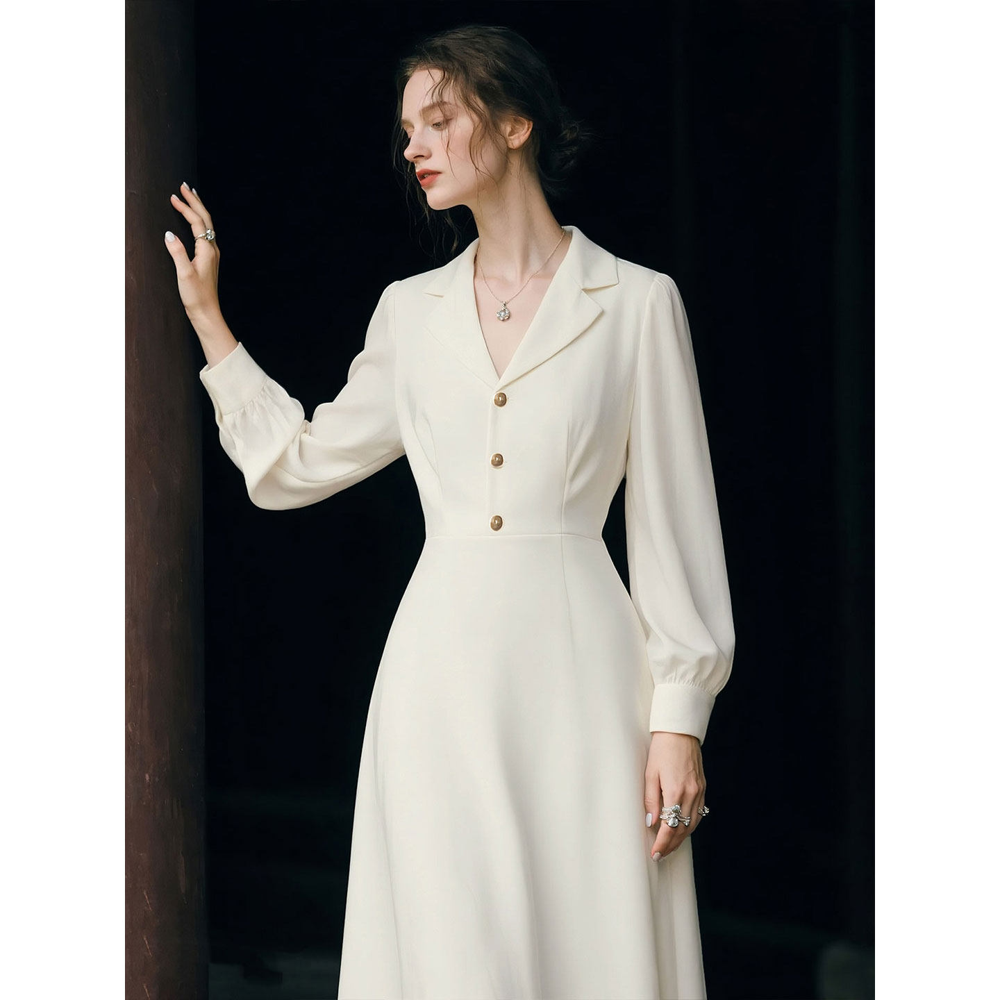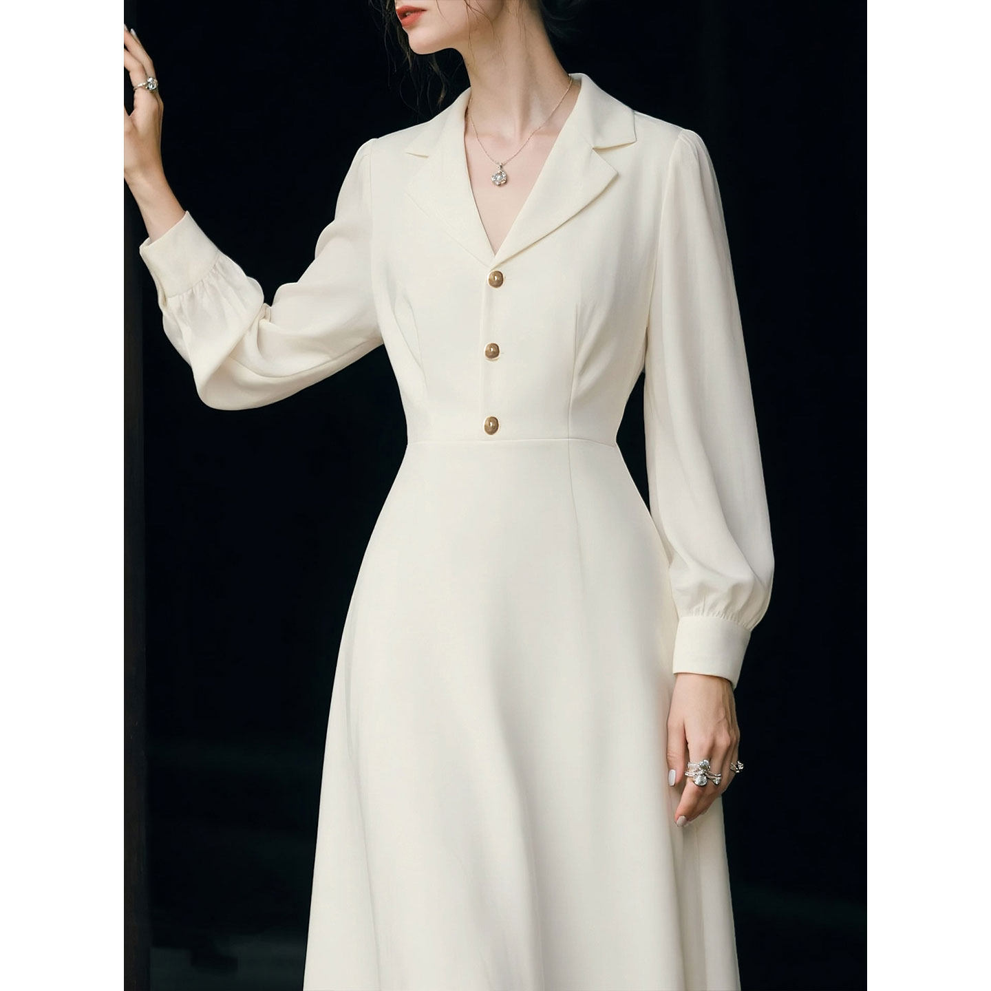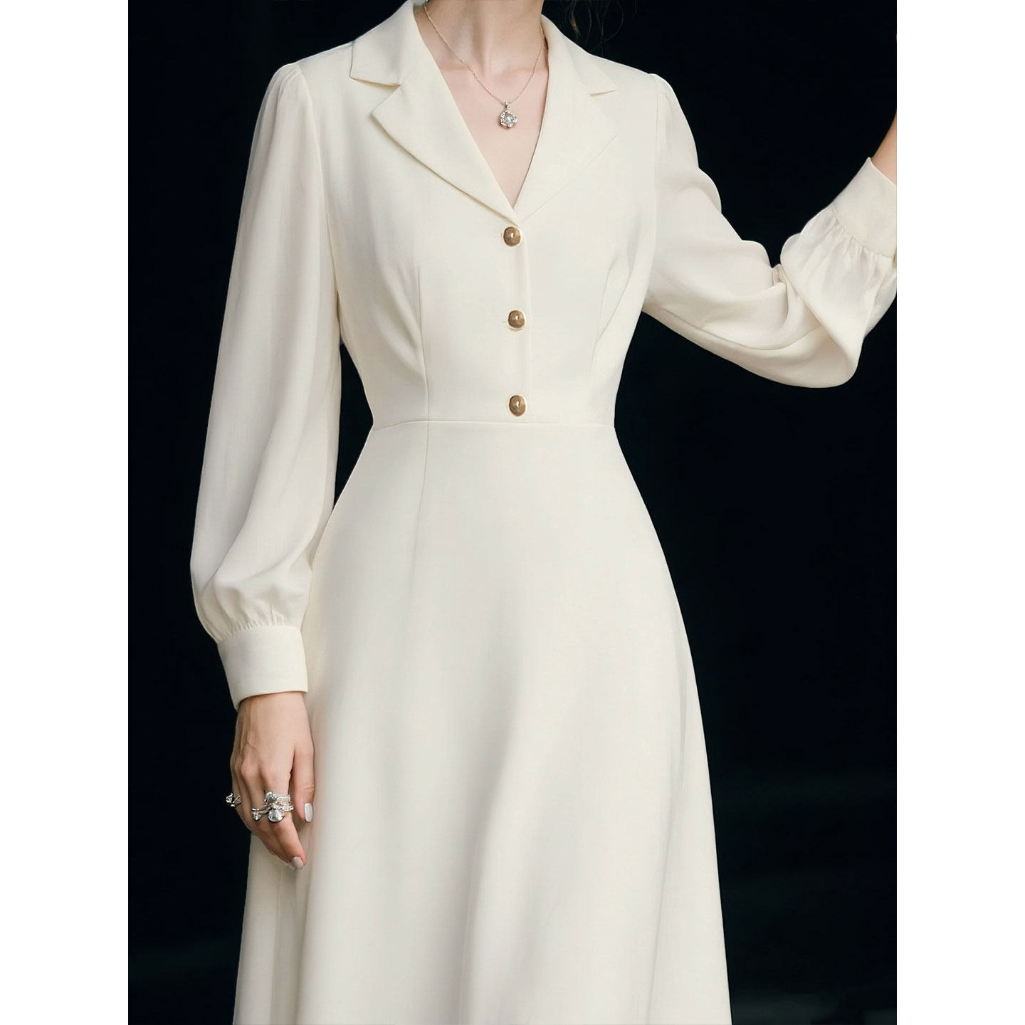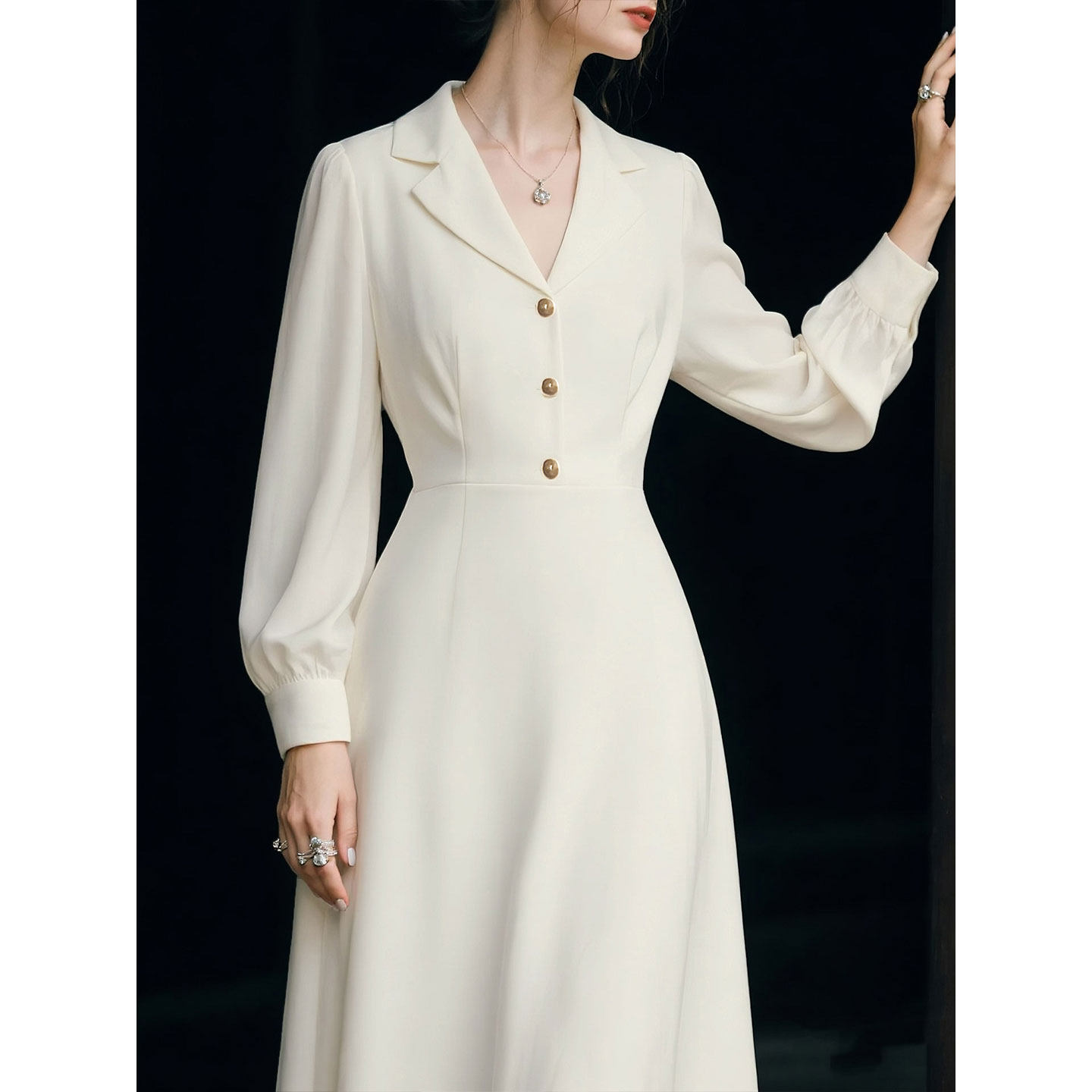 白色翻领长袖西装连衣裙女2026年春季新款高级感时尚百搭气质长裙