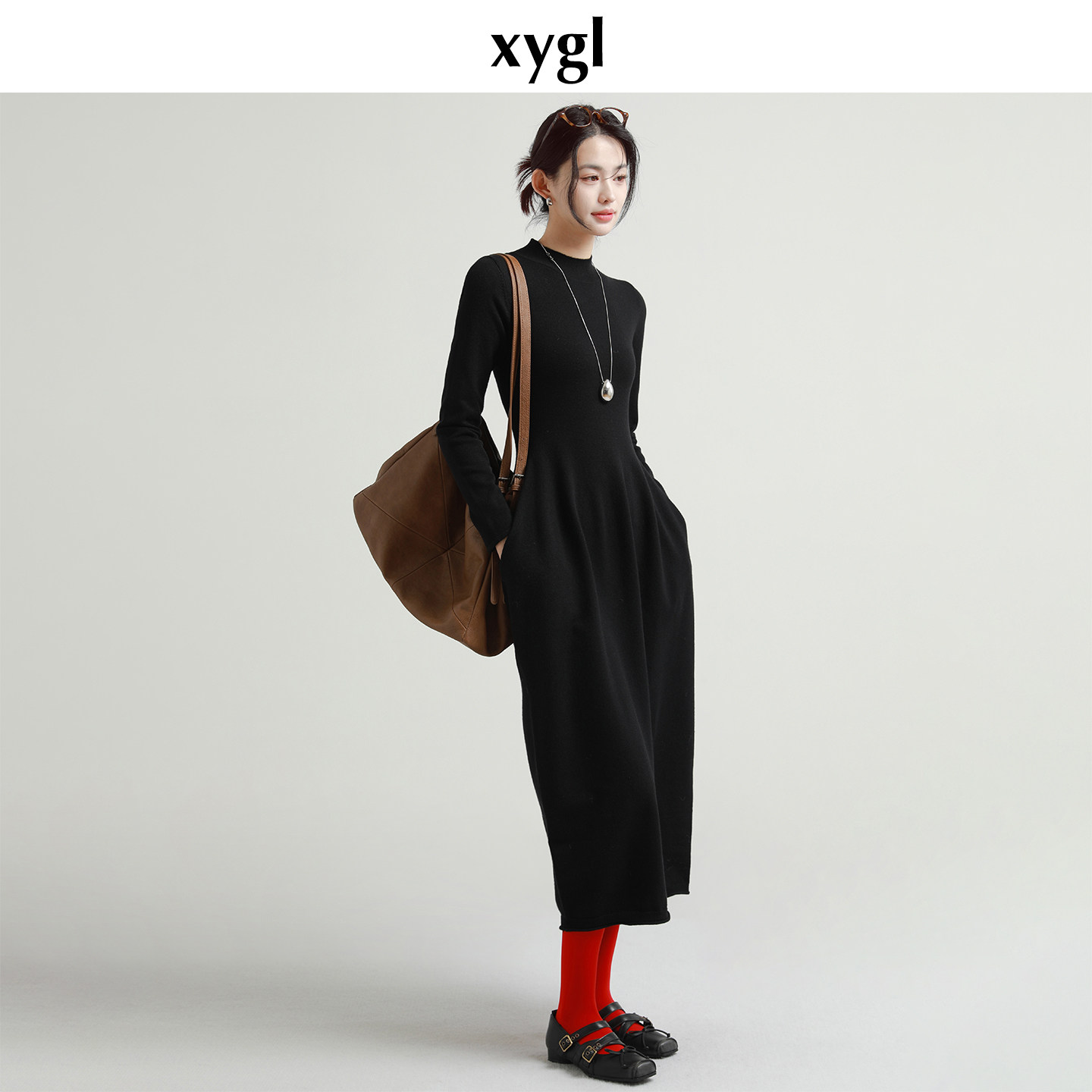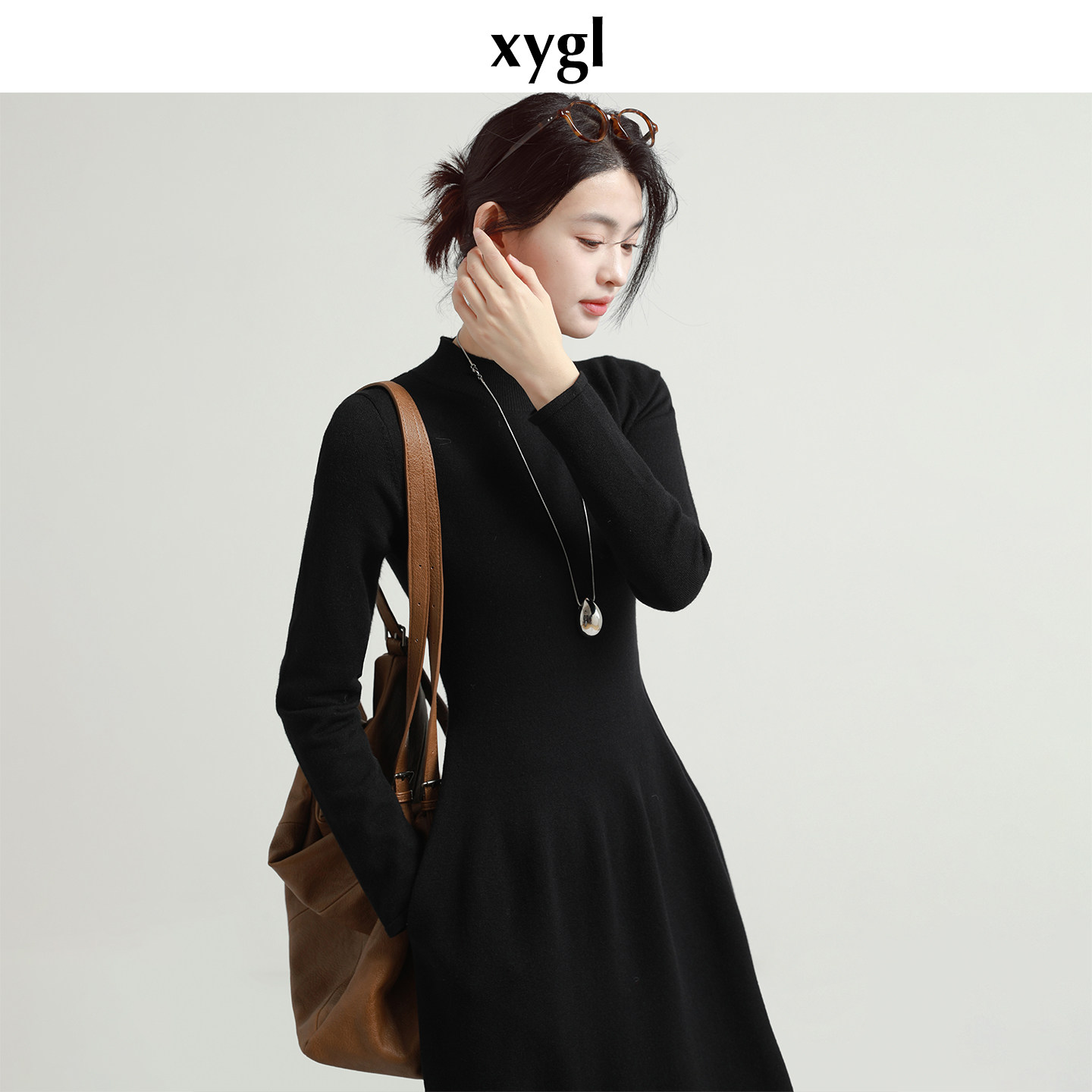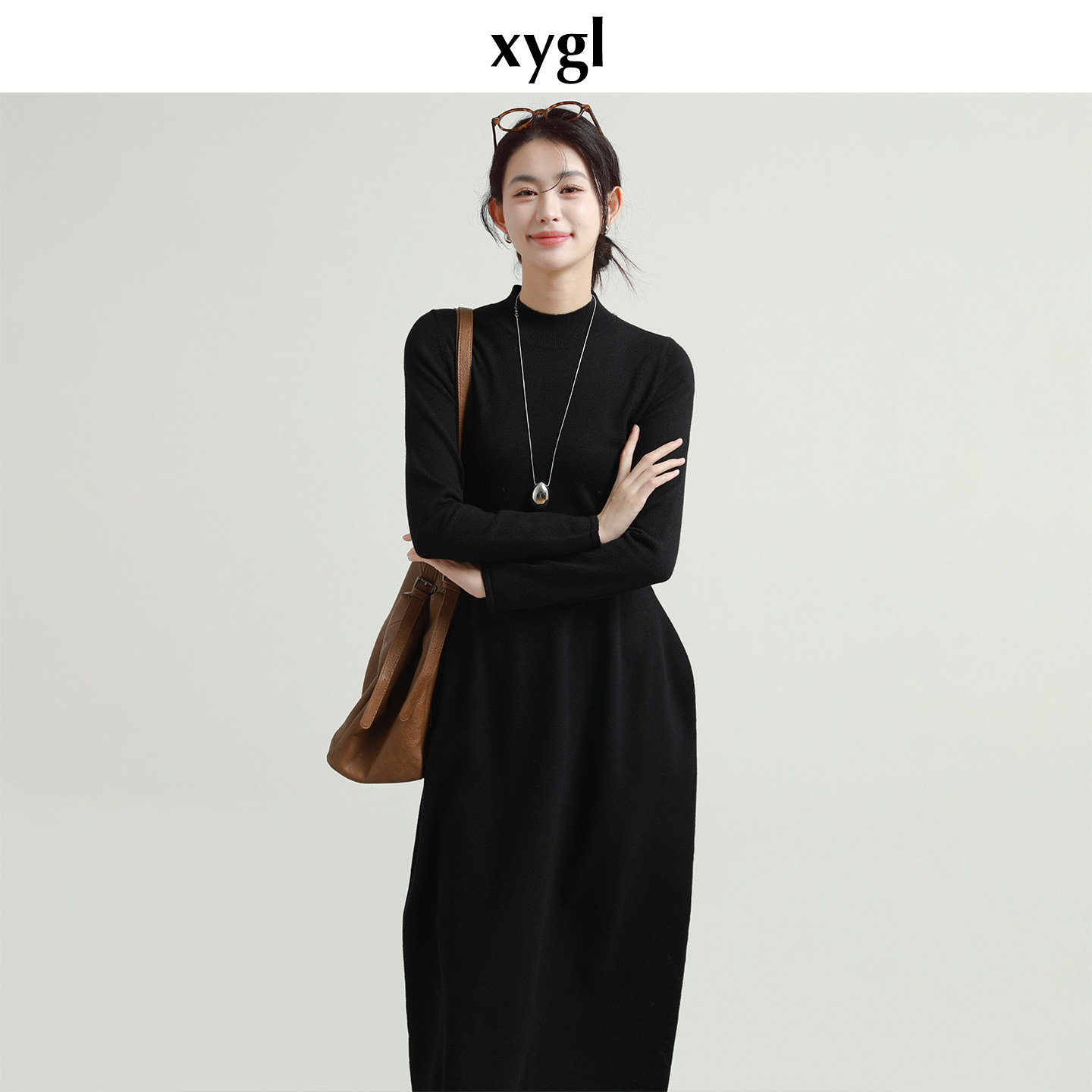 稀有概率 雕刻曼妙 收腰显瘦针织连衣裙女秋冬黑色中长款修身裙子
