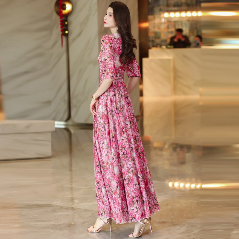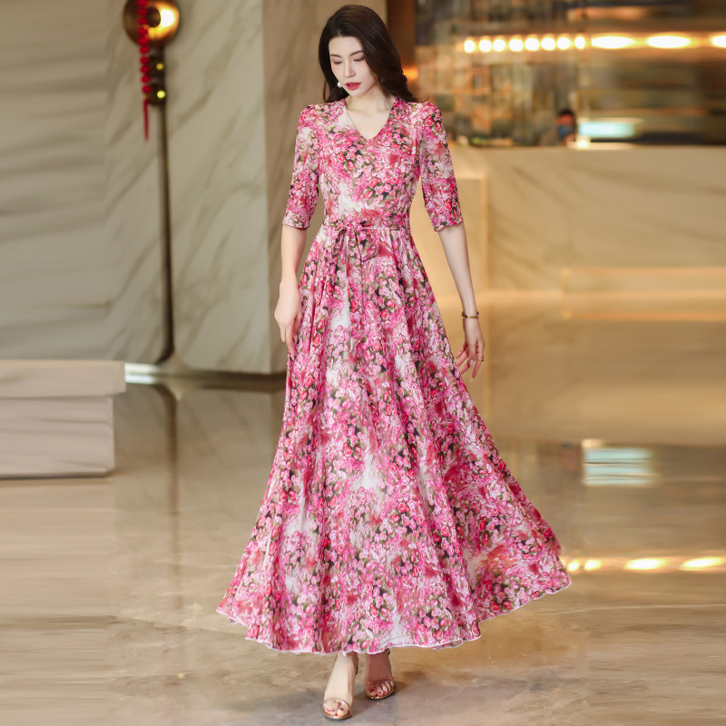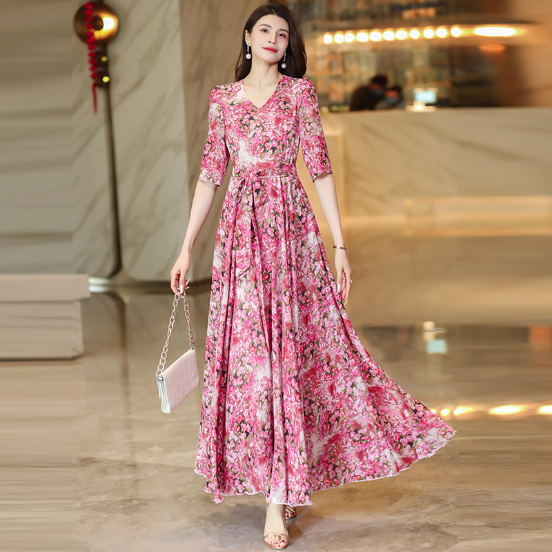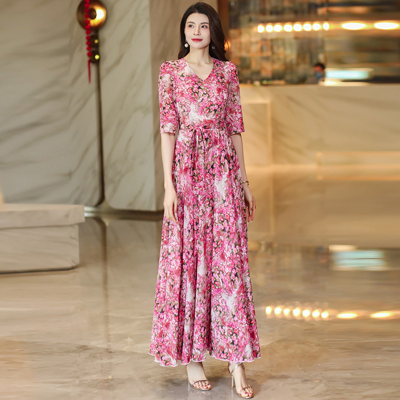 2025年春秋冬收腰显瘦长裙妈妈款短款小个子沙滩裙V领印花连衣裙