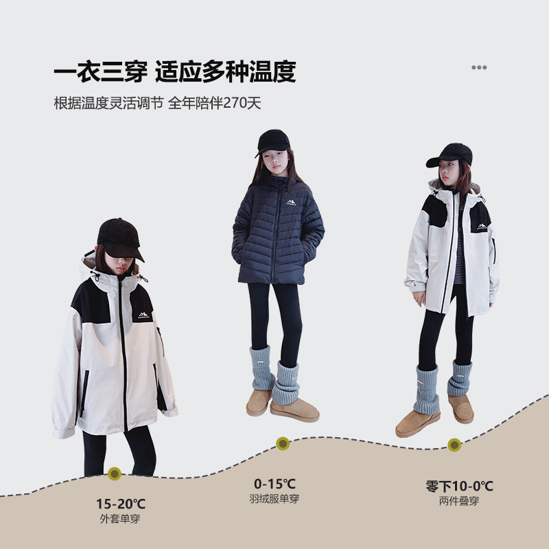 女童户外三合一羽绒服三防外套2025冬装新款女大童初中生校服内胆