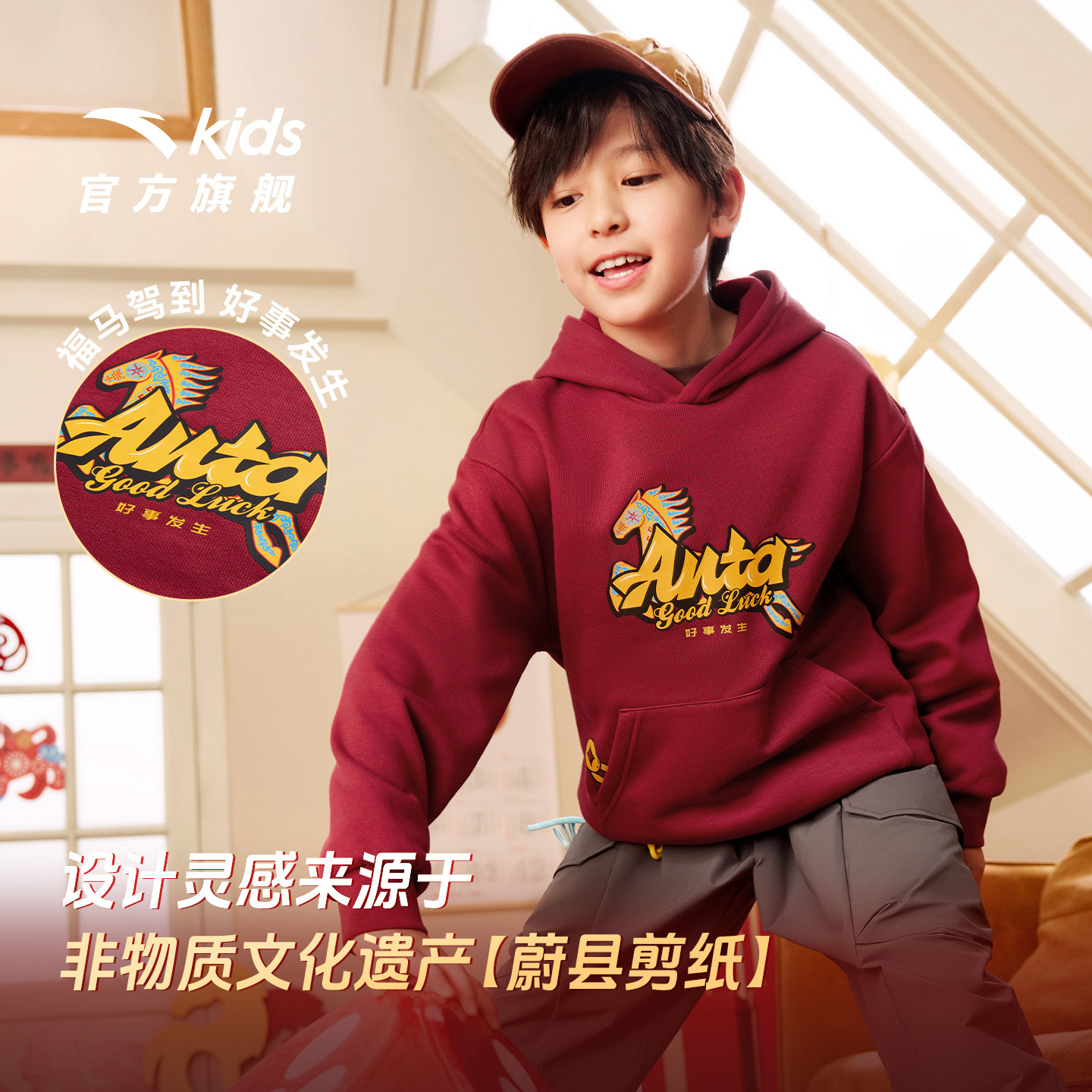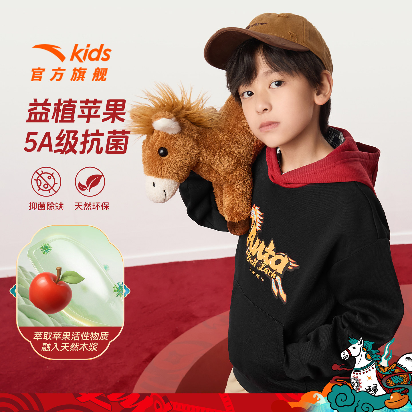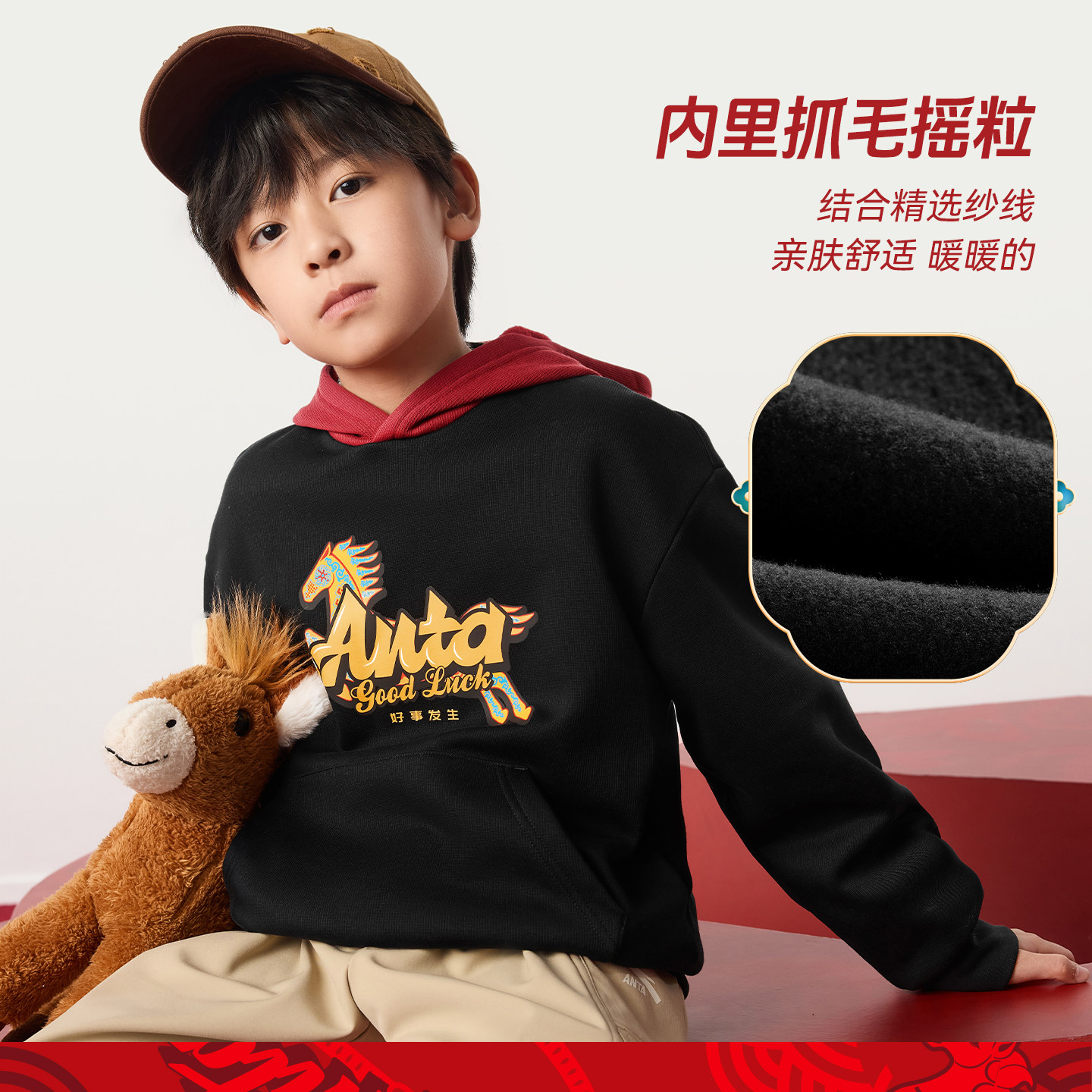安踏儿童加绒卫衣男童连帽2026新年款上衣大童马年本命年红色衣服