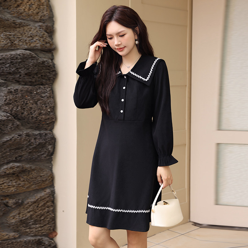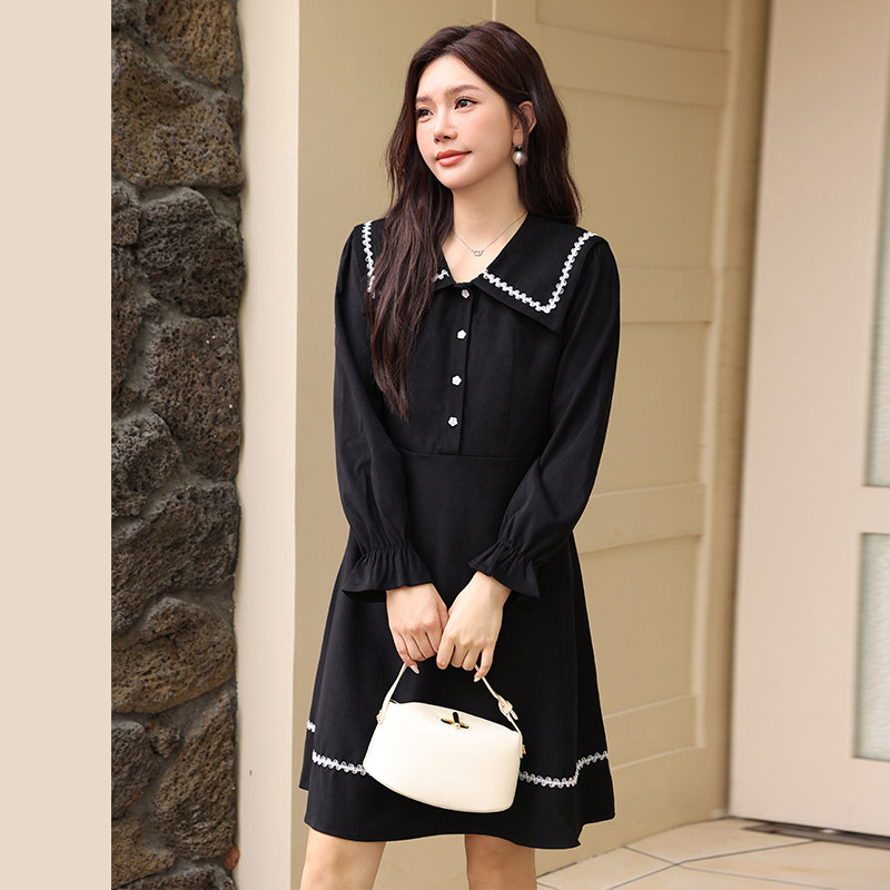 气质显瘦胖MM长袖小黑裙冬装新款大码女装海军领收腰A字版连衣裙