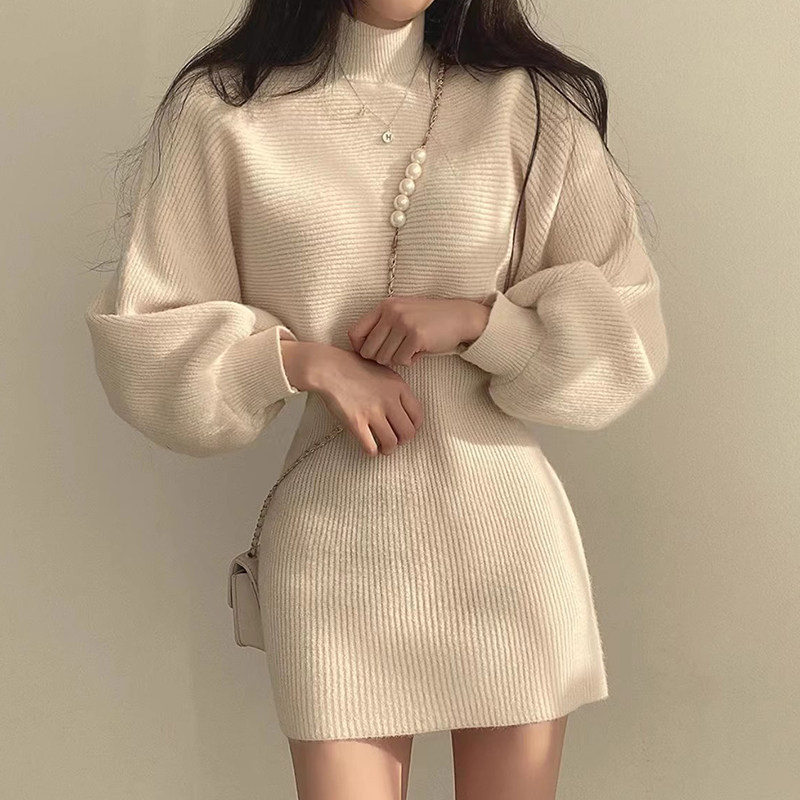 韩国chic秋冬法式复古针织背心包臀连衣裙+高领短款长袖毛衣套装
