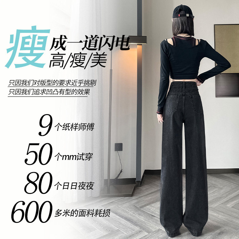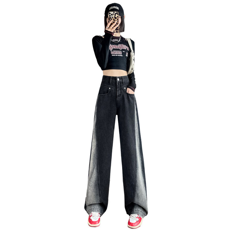渐变撞色阔腿牛仔裤女2026年新款黑灰色春装高腰直筒拖地裤春季装