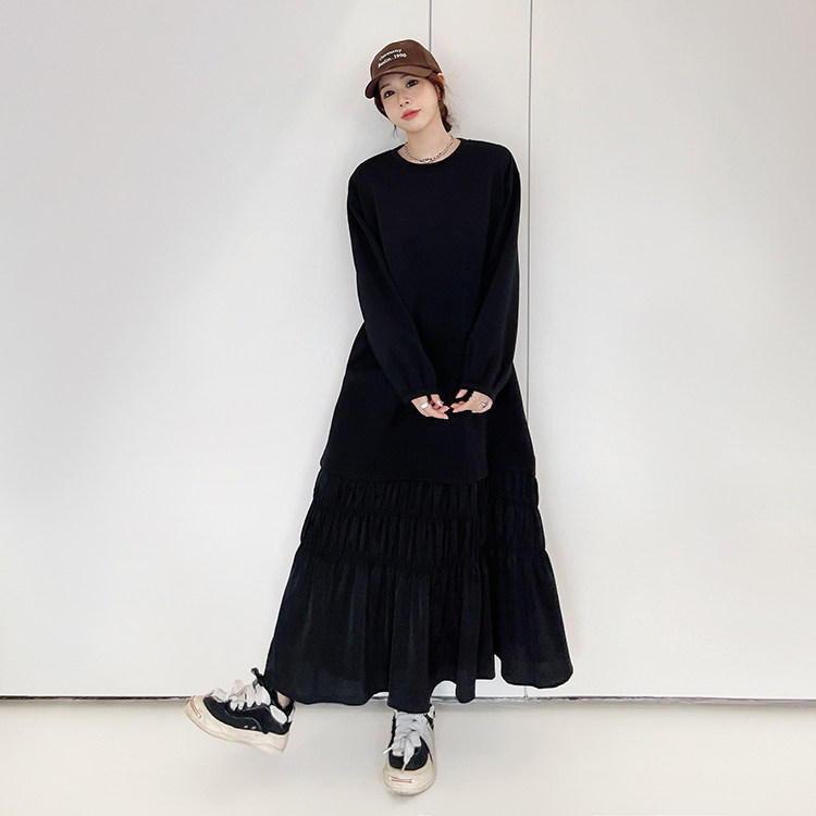 秋冬季大码女装胖mm宽松显瘦长款拼接抽褶裙摆长袖加厚连衣裙