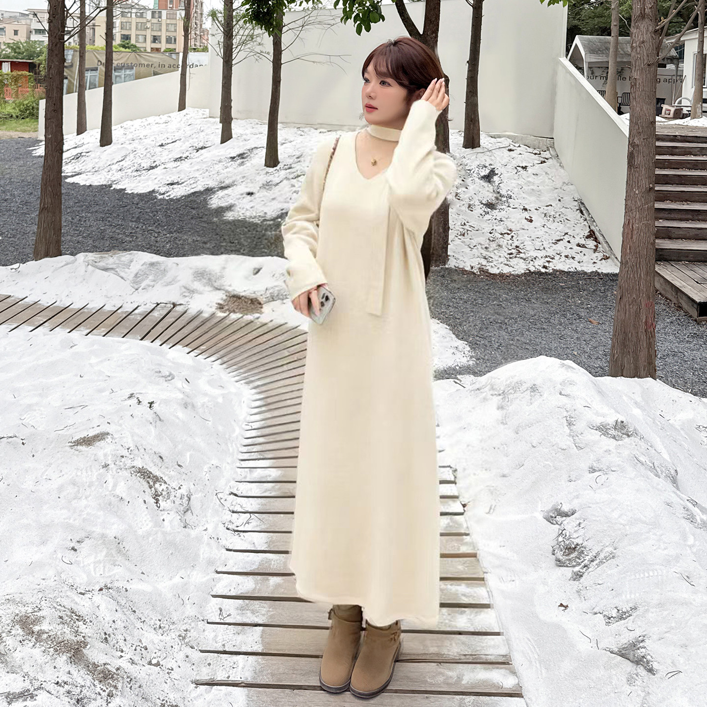 2025冬季新款大码女装胖MM围巾直筒连衣裙女宽松显瘦毛织裙长裙
