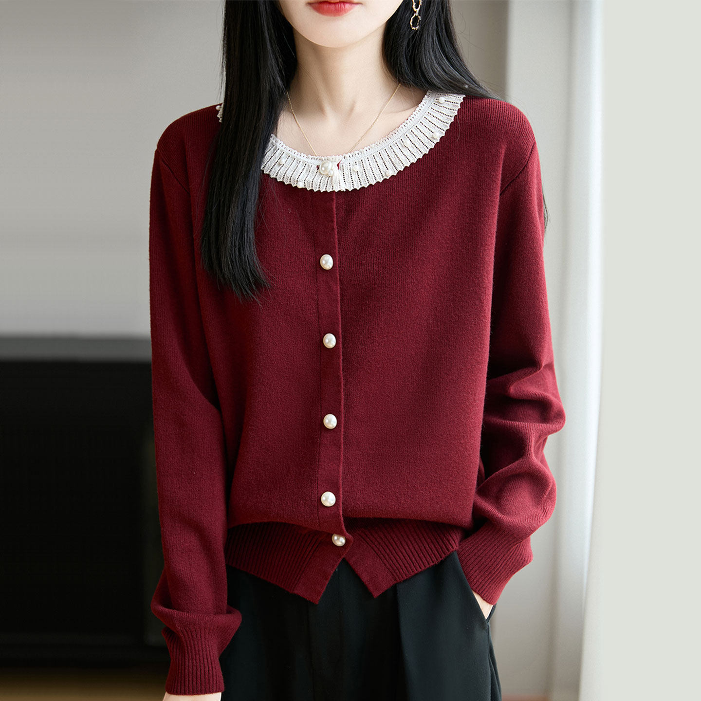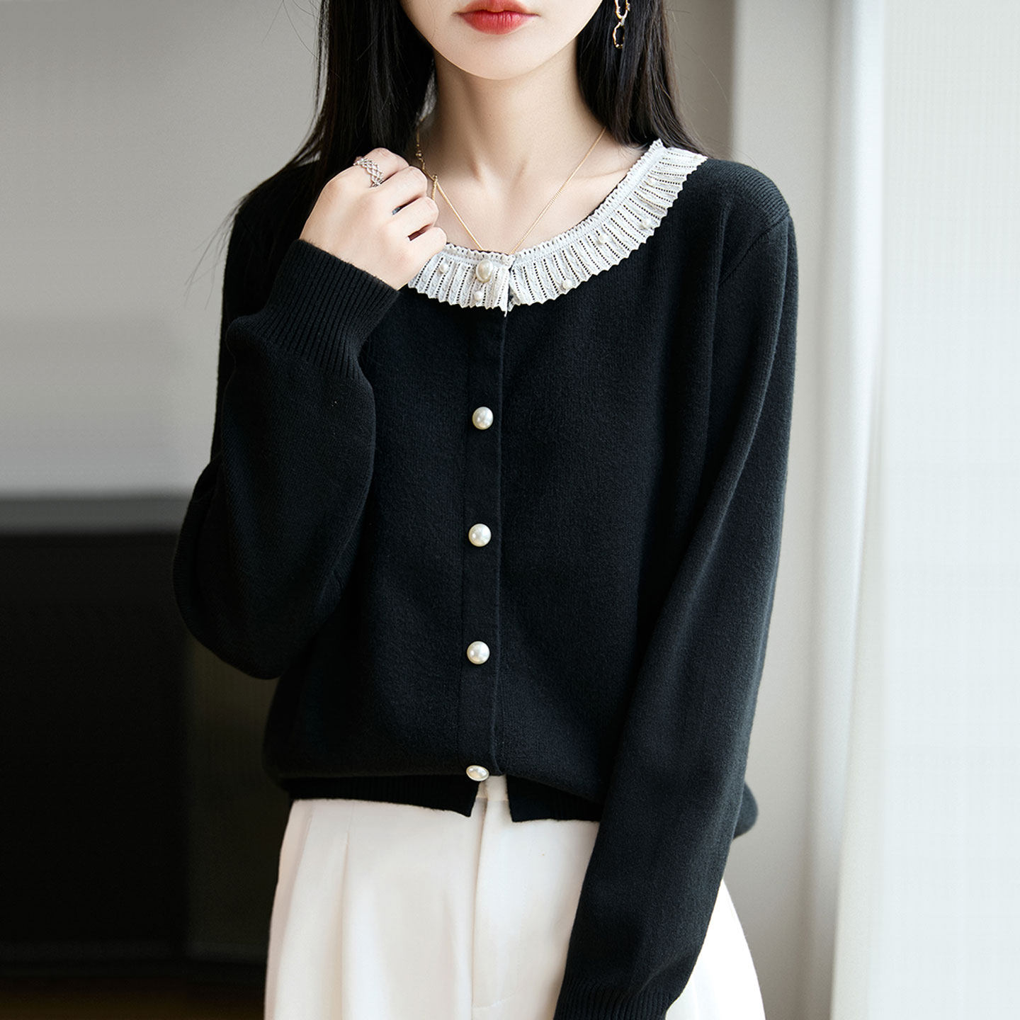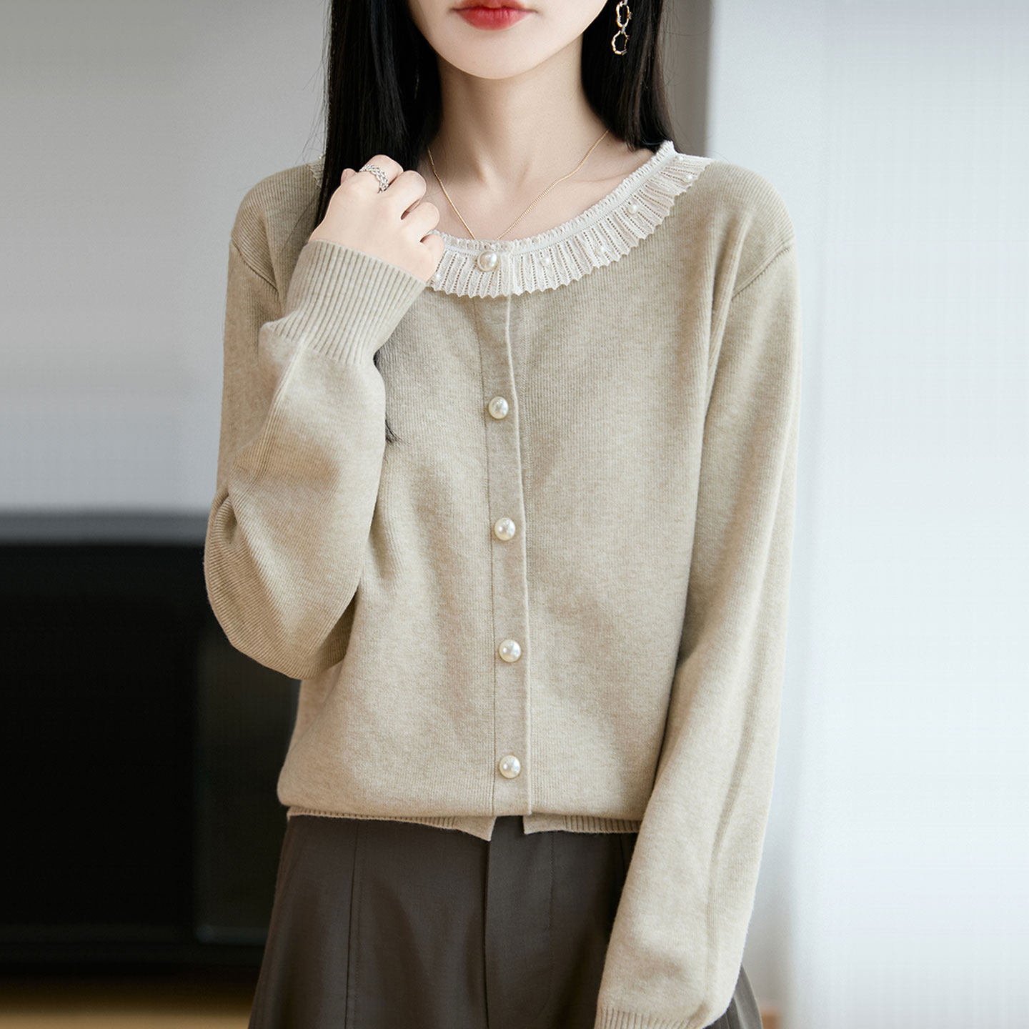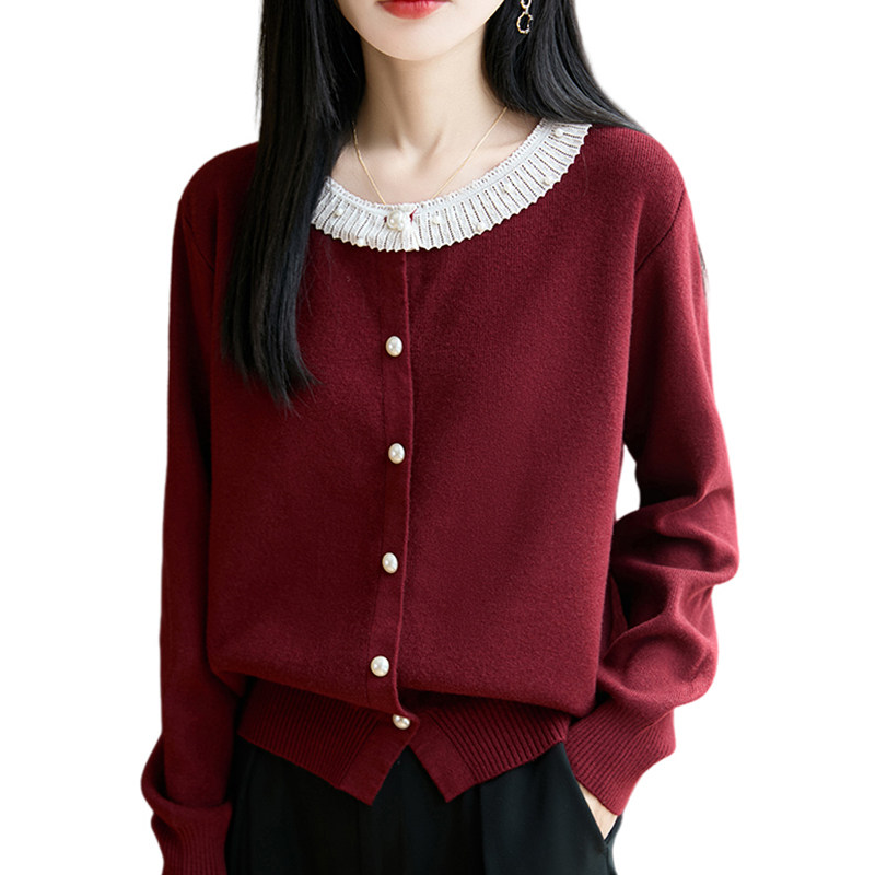 纯色花边圆领针织开衫女士毛衣秋冬季新款洋气百搭时尚宽松外搭