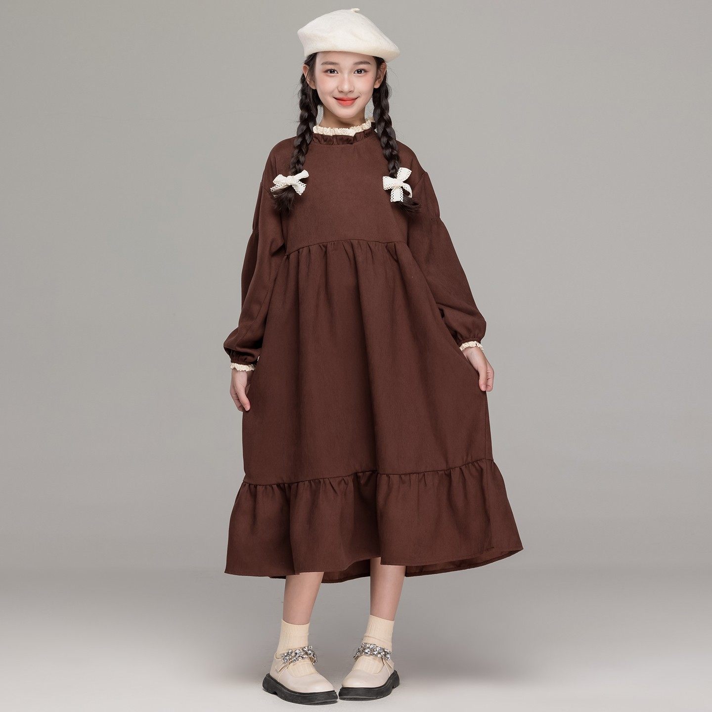 咖色法式文艺长袖连衣裙女童秋冬季2025新款甜美裙子喜庆加绒冬裙