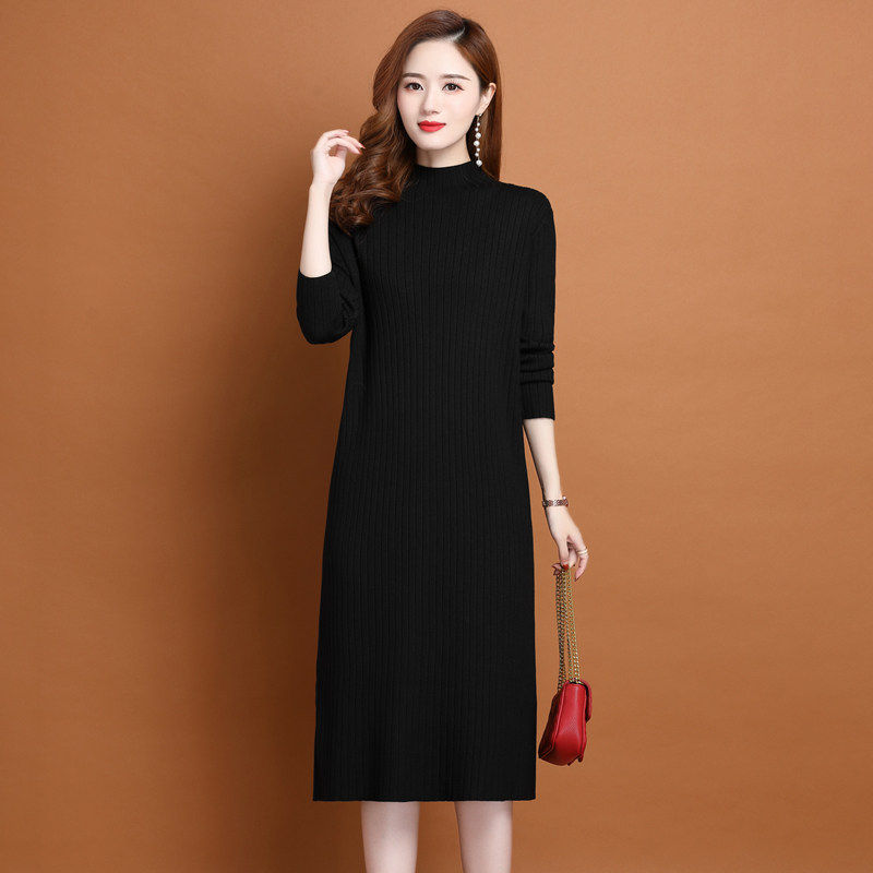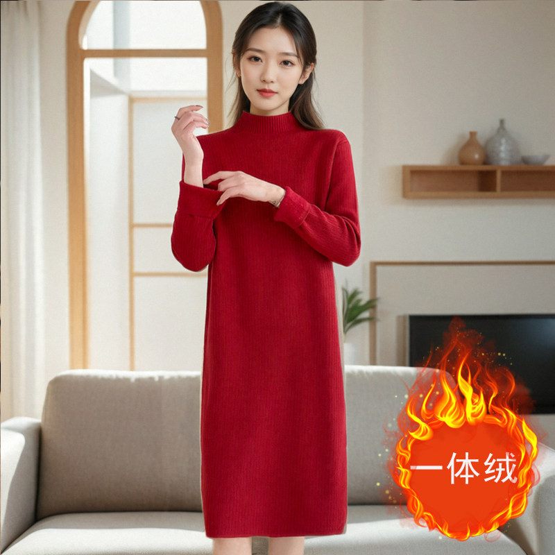 半高领毛衣裙针织连衣裙内搭秋冬女中长款加绒加厚一体绒打底长裙