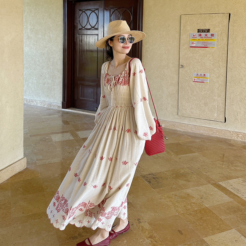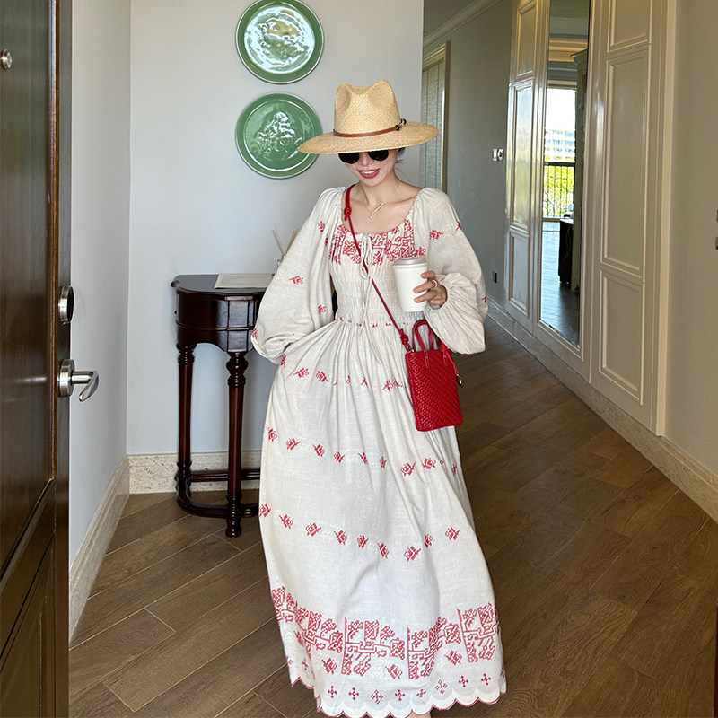 金苏一红色花朵刺绣亚麻连衣裙2026春夏法式收腰长袖裙子chic长裙