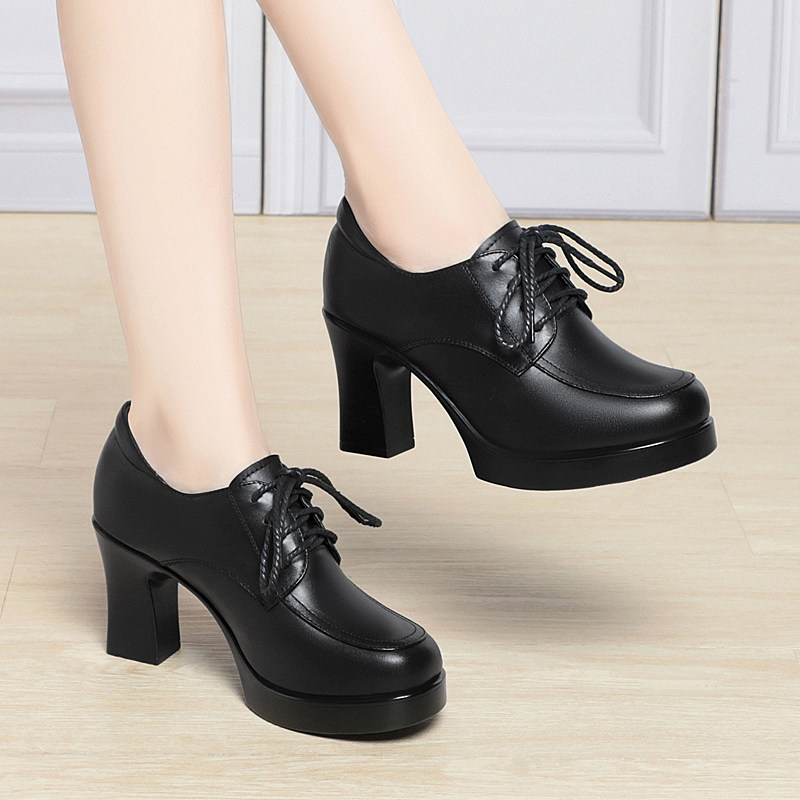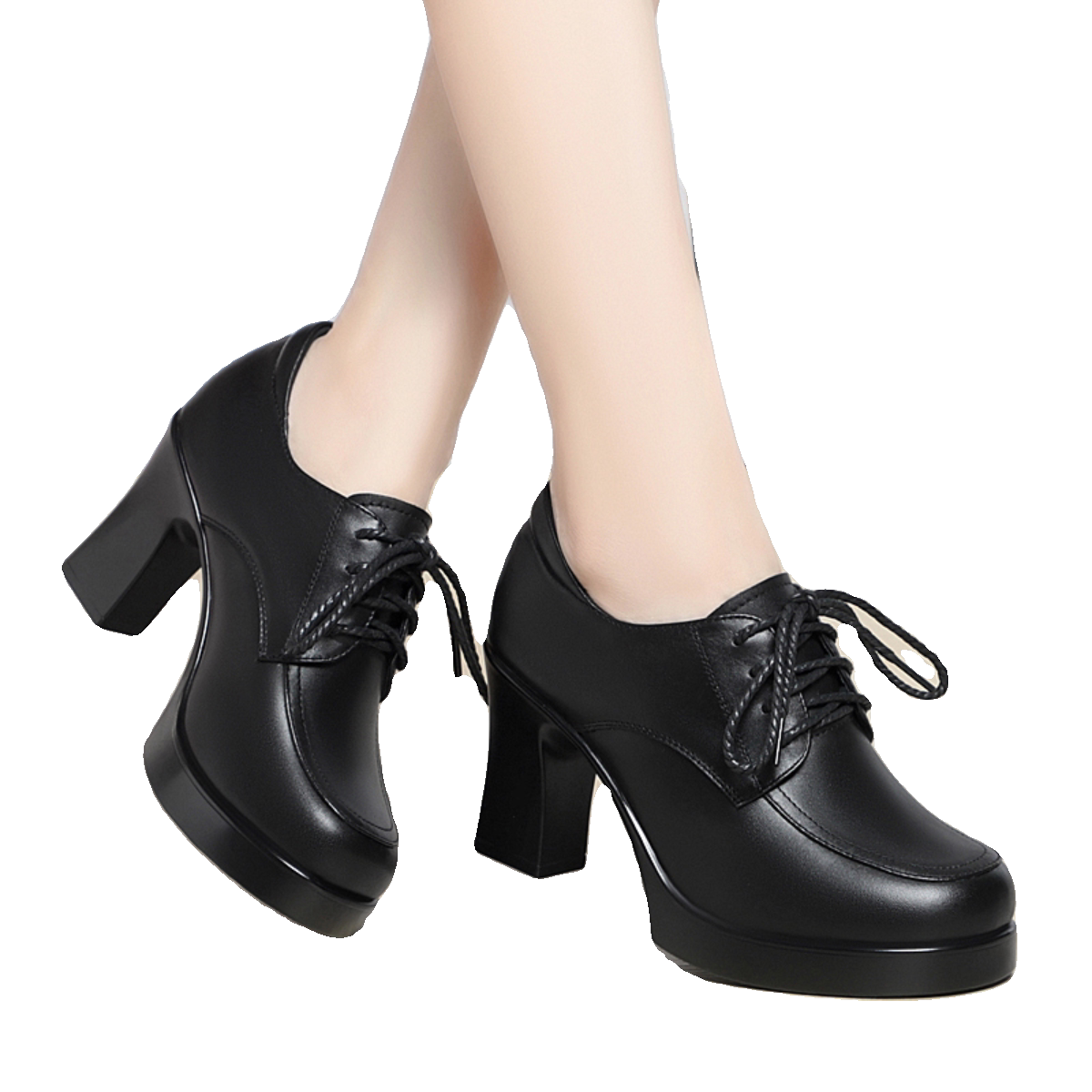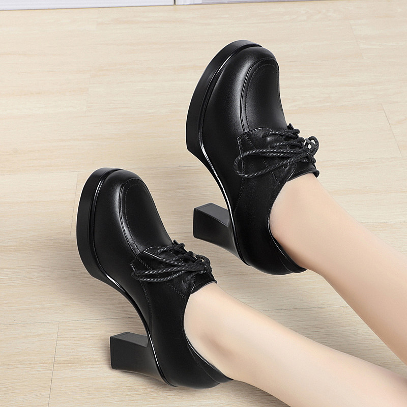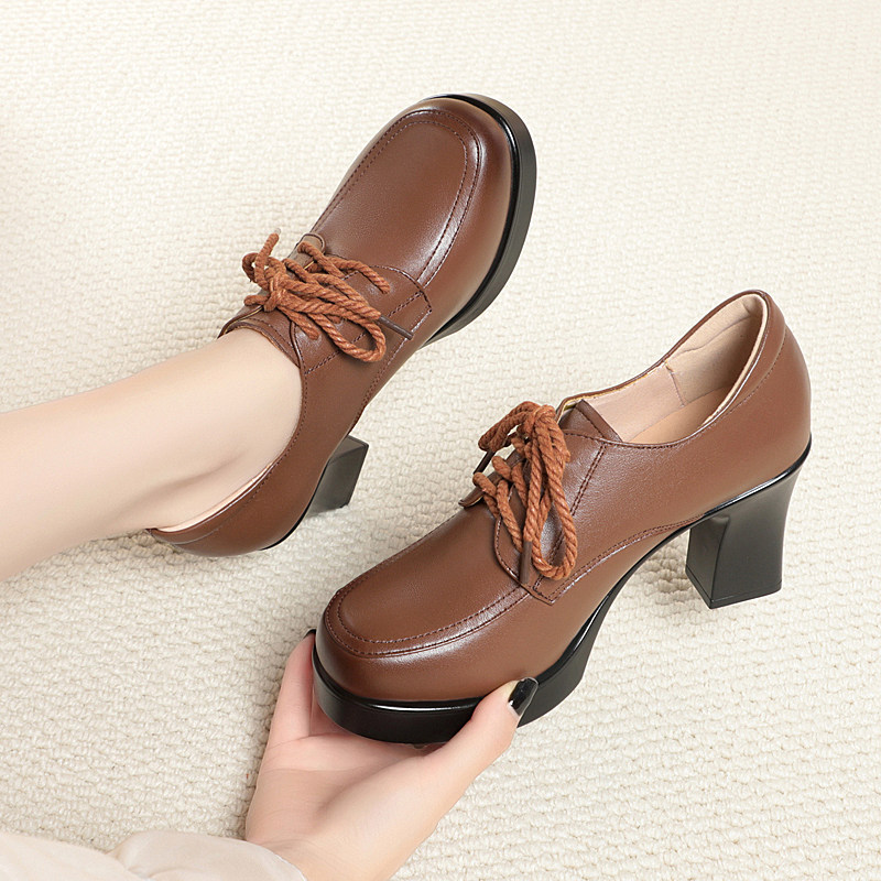 高跟鞋女春秋款圆头真皮单鞋防水台粗跟厚底女鞋女士棕色小皮鞋33
