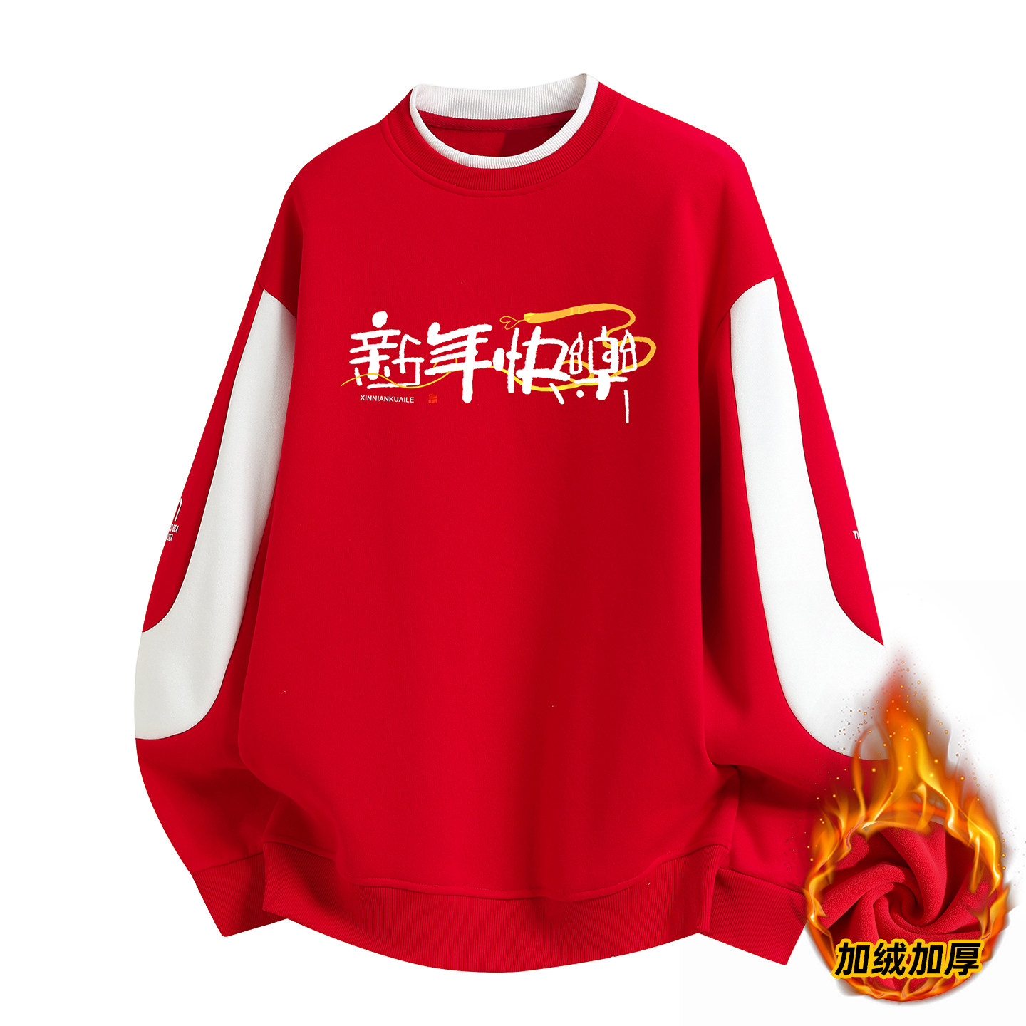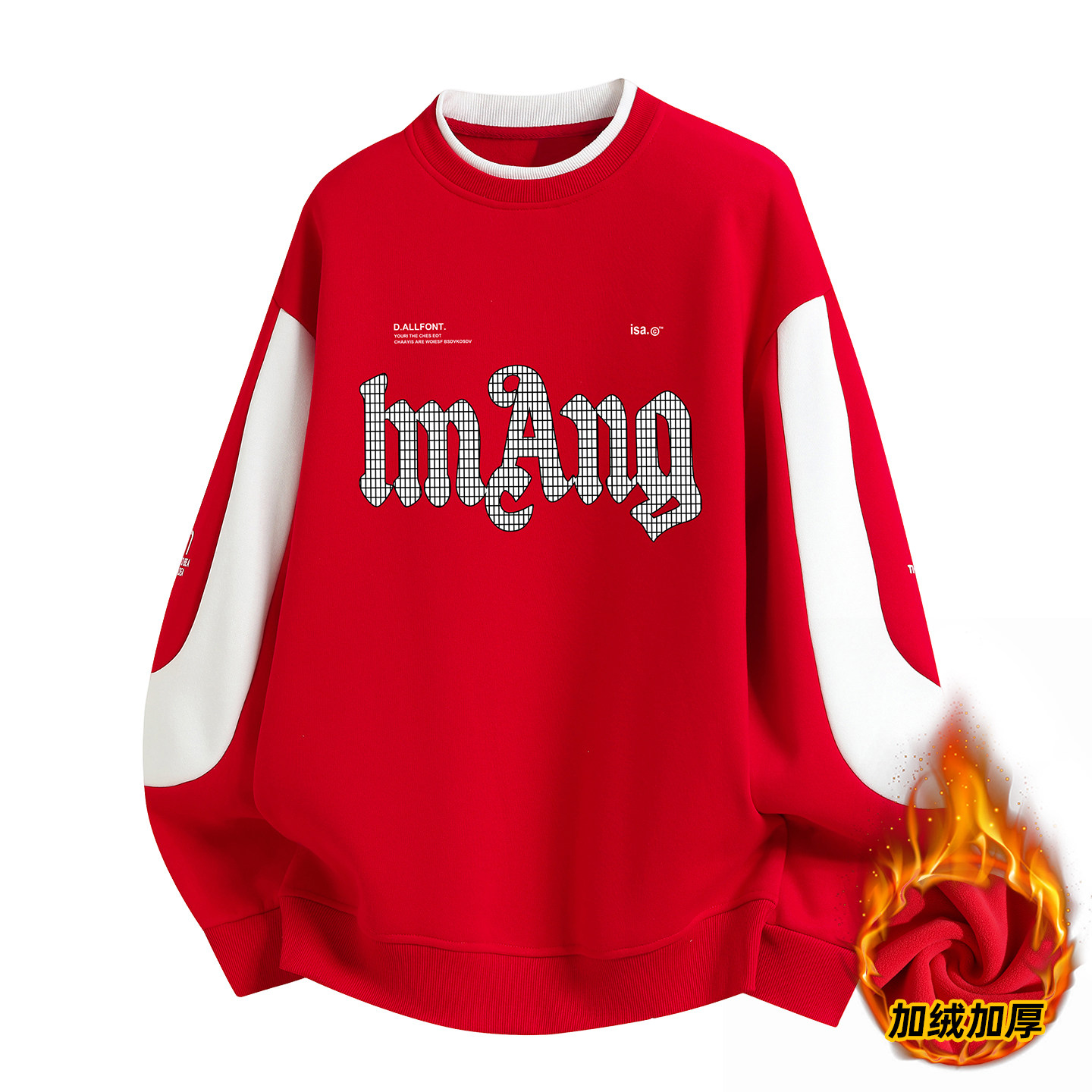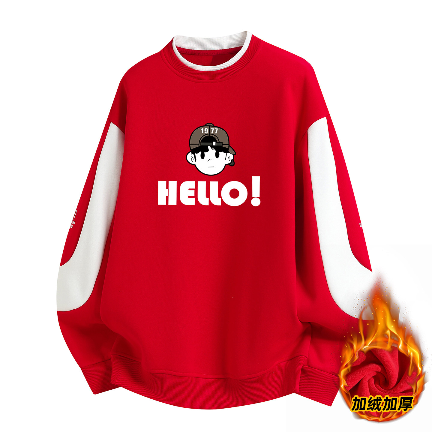 秋冬款长袖t恤男孩青少年加绒加厚红色卫衣冬装圆领打底衫上衣服