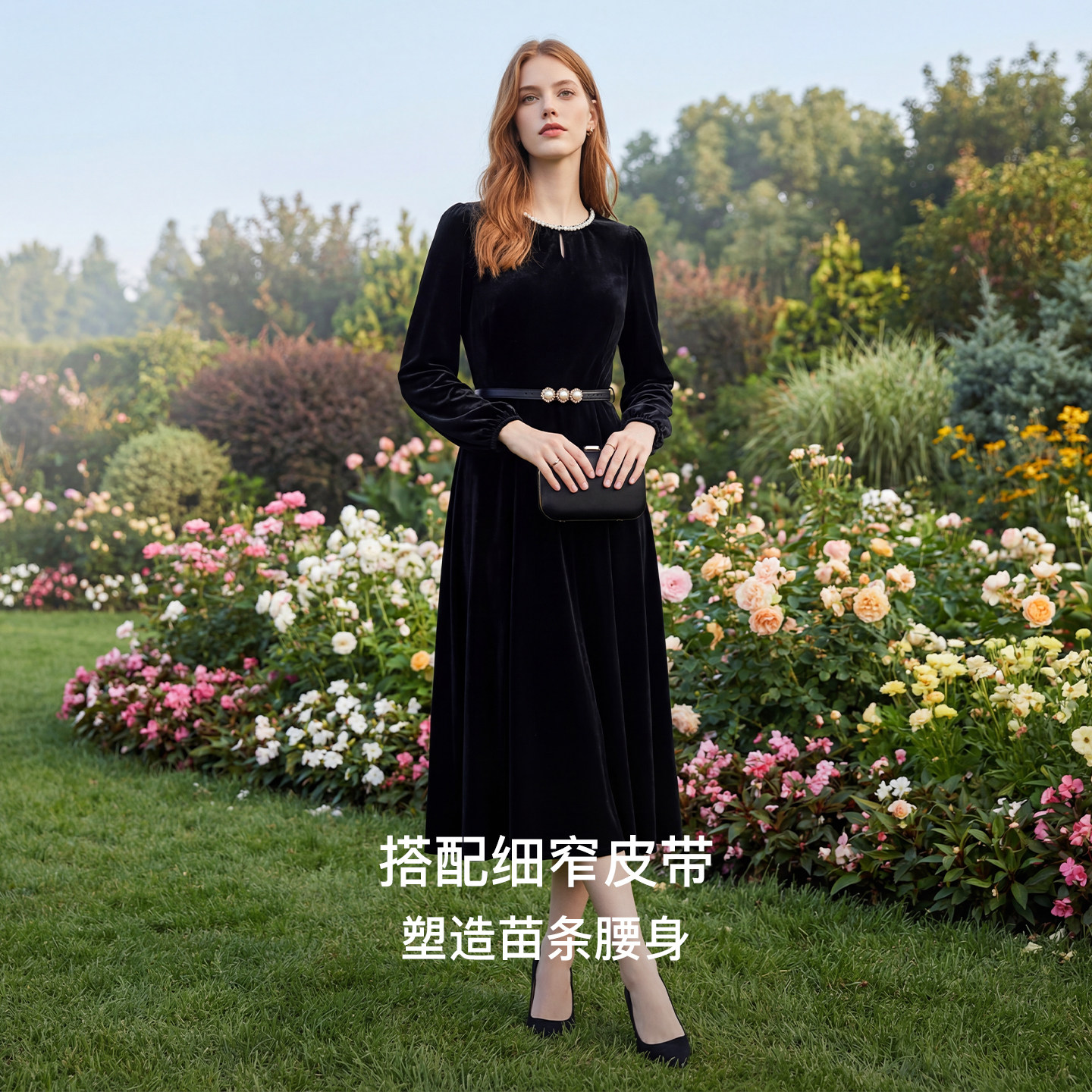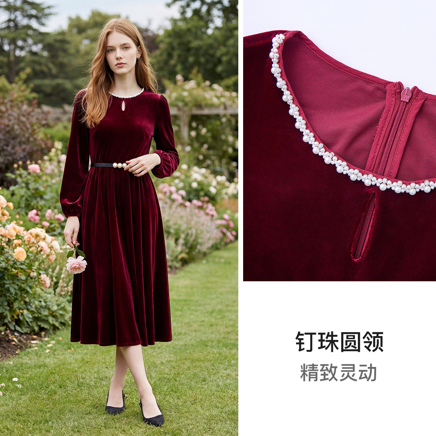 311线报网描述:复古丝绒面料 钉珠装饰圆领 收腰显瘦版型
