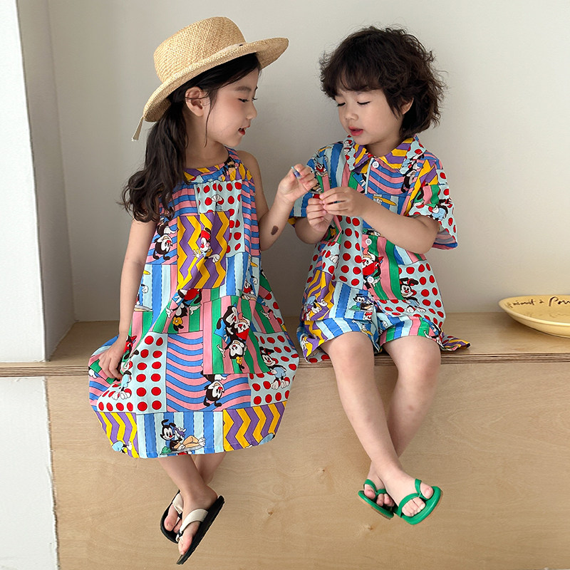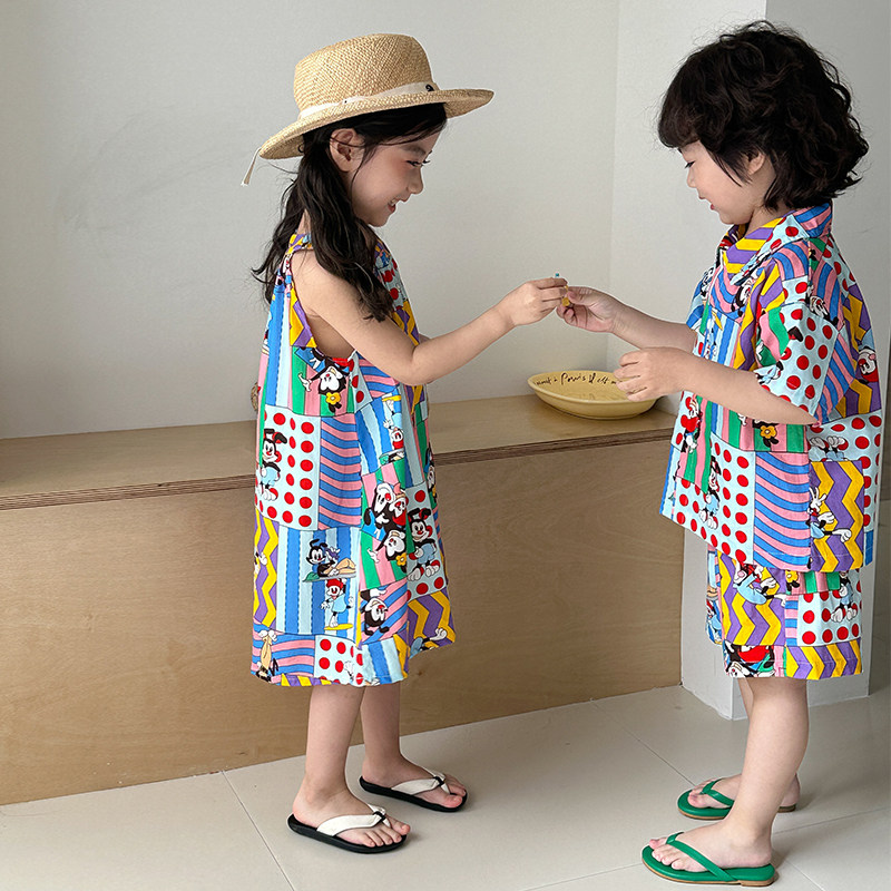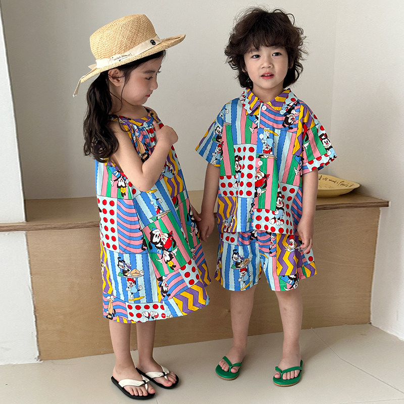 儿童夏季衬衫套装男童海边度假2025新款宝宝洋气女童连衣裙兄妹装