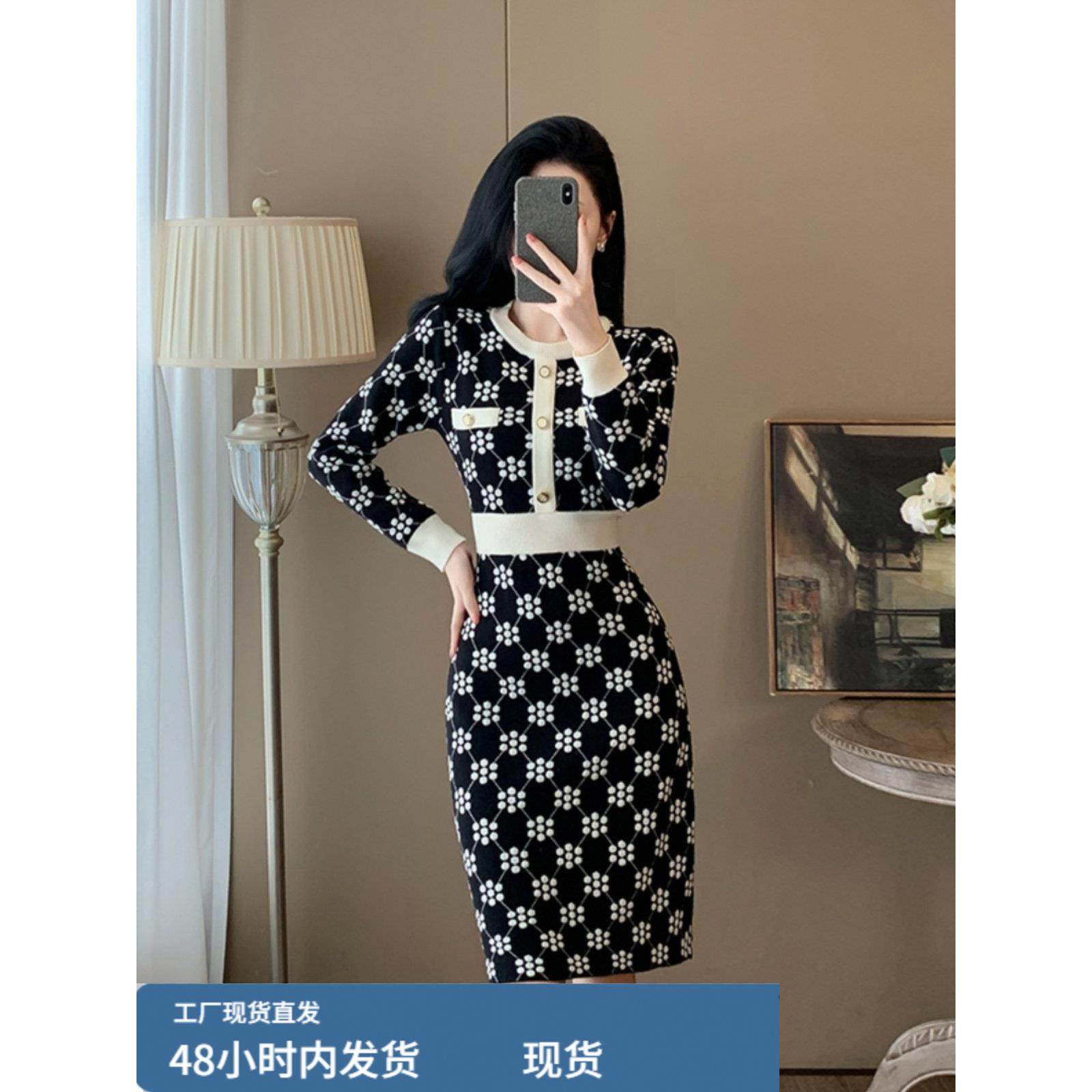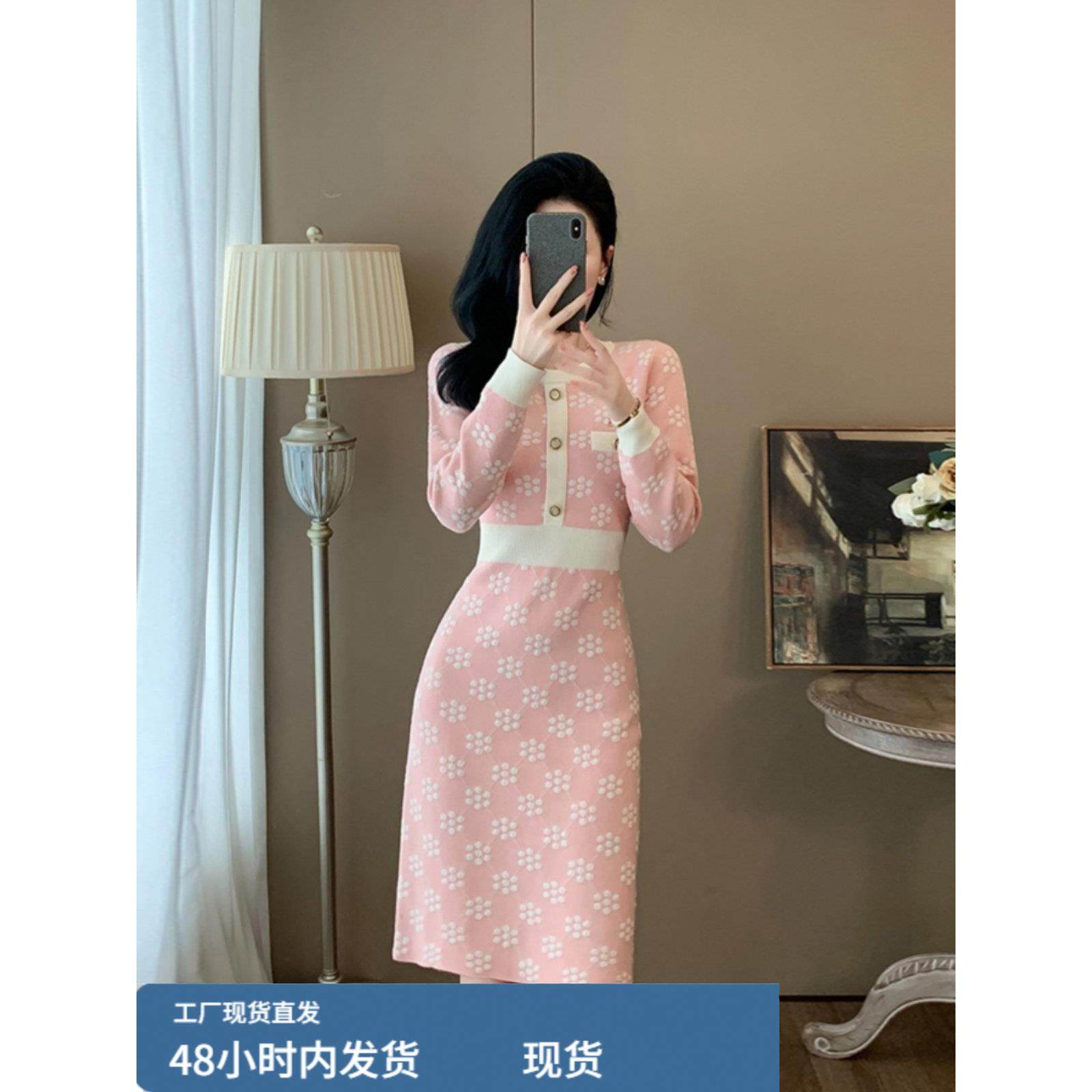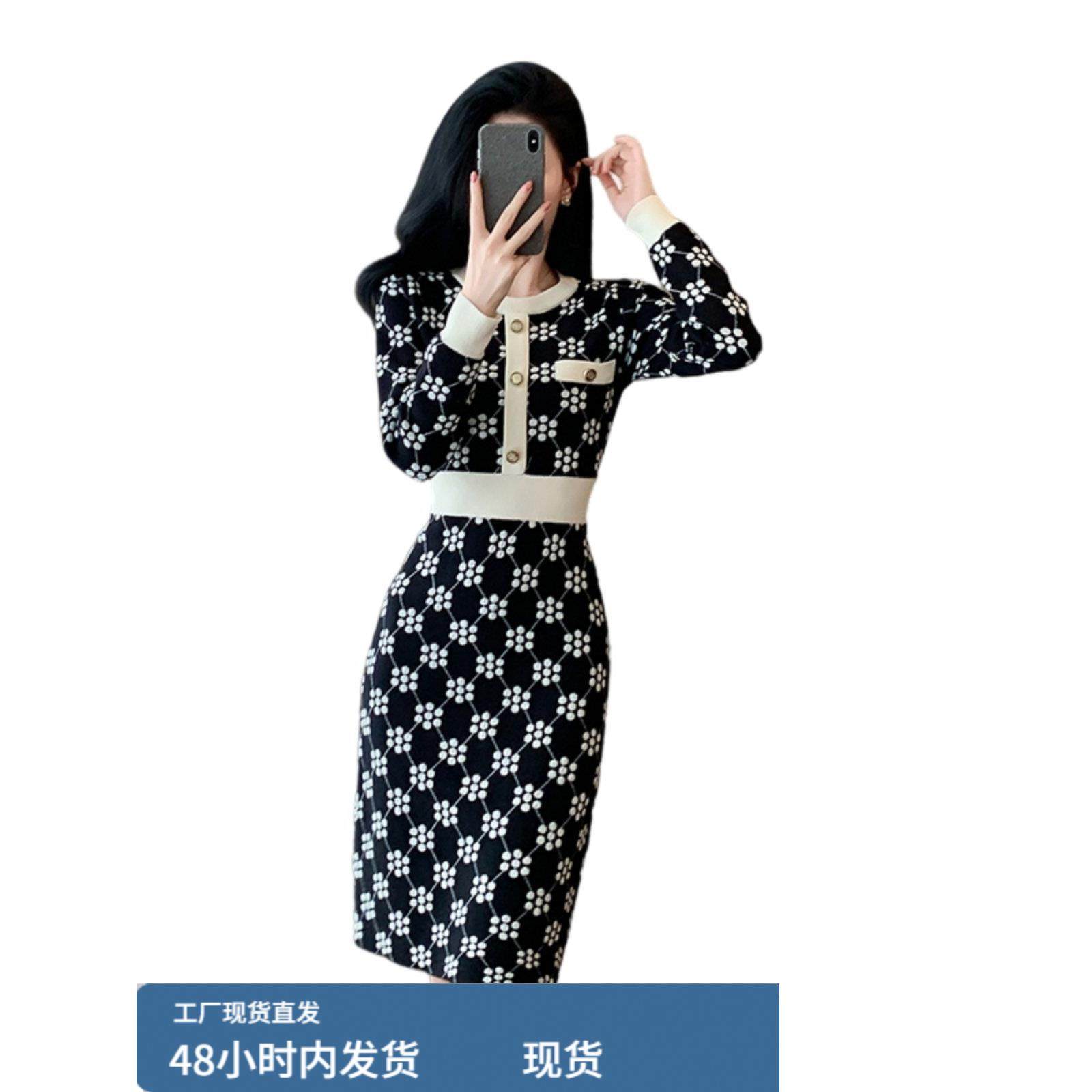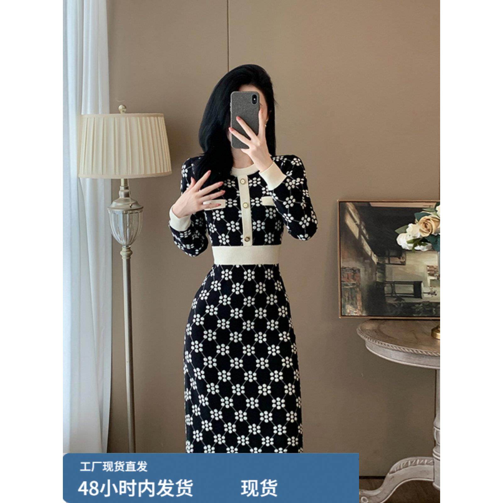 秋冬季新款圆领长袖针织连衣裙收腰显瘦小香风外穿内搭打底毛衣裙