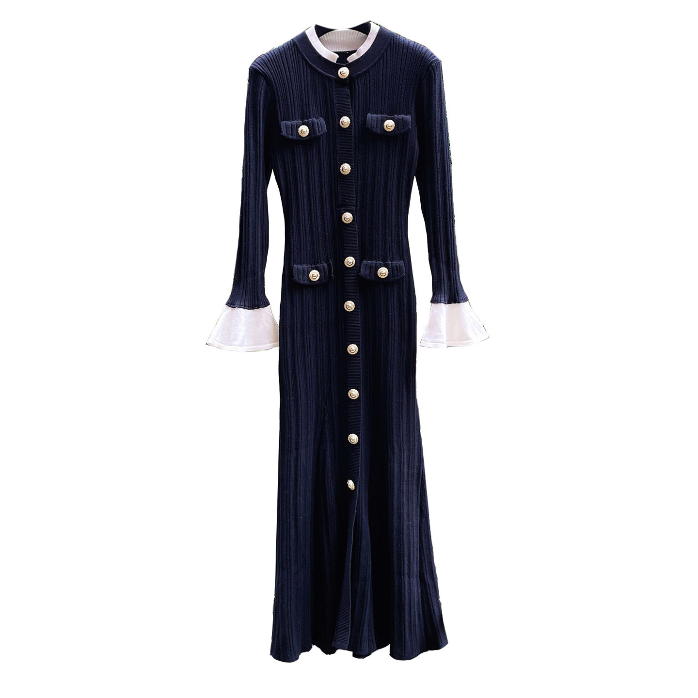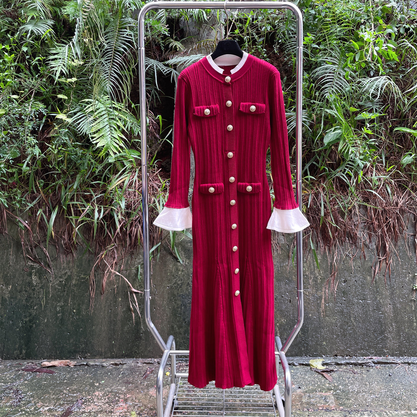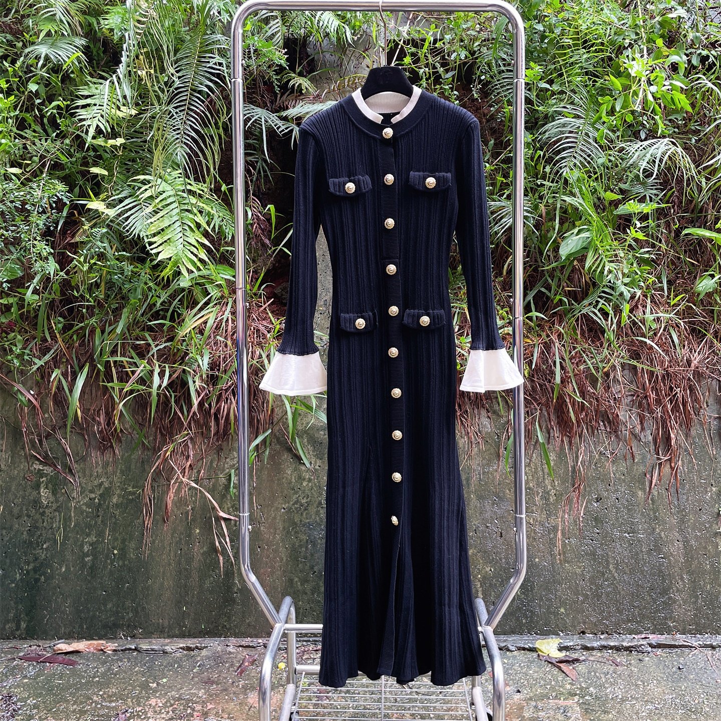 2025秋冬法式优雅名媛修身显瘦撞色圆领喇叭袖长款针织鱼尾连衣裙